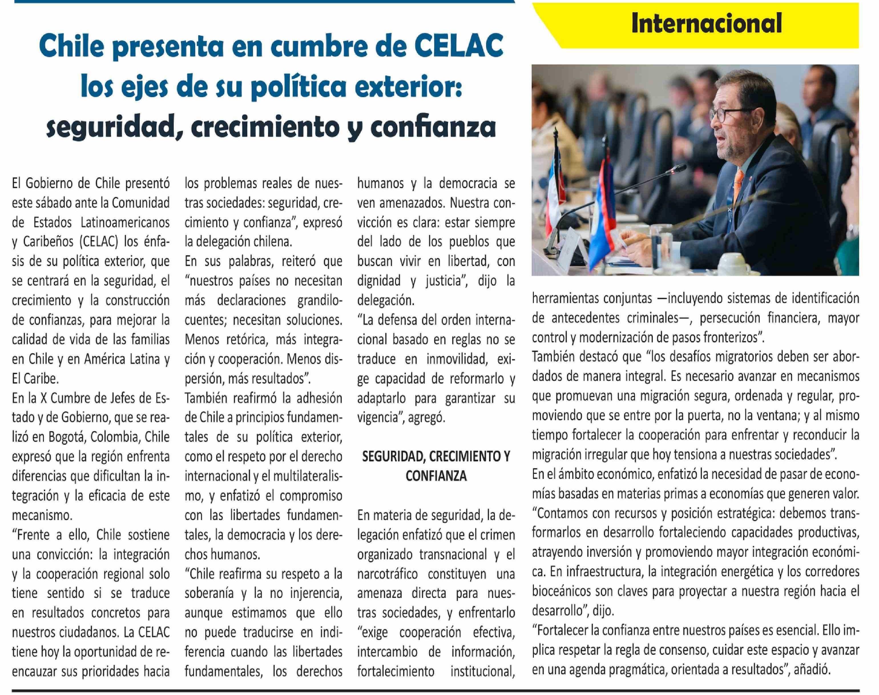 Chile presenta en cumbre de CELAC los ejes de su política exterior: seguridad, crecimiento y confianza 24-03-2026 El Longino |