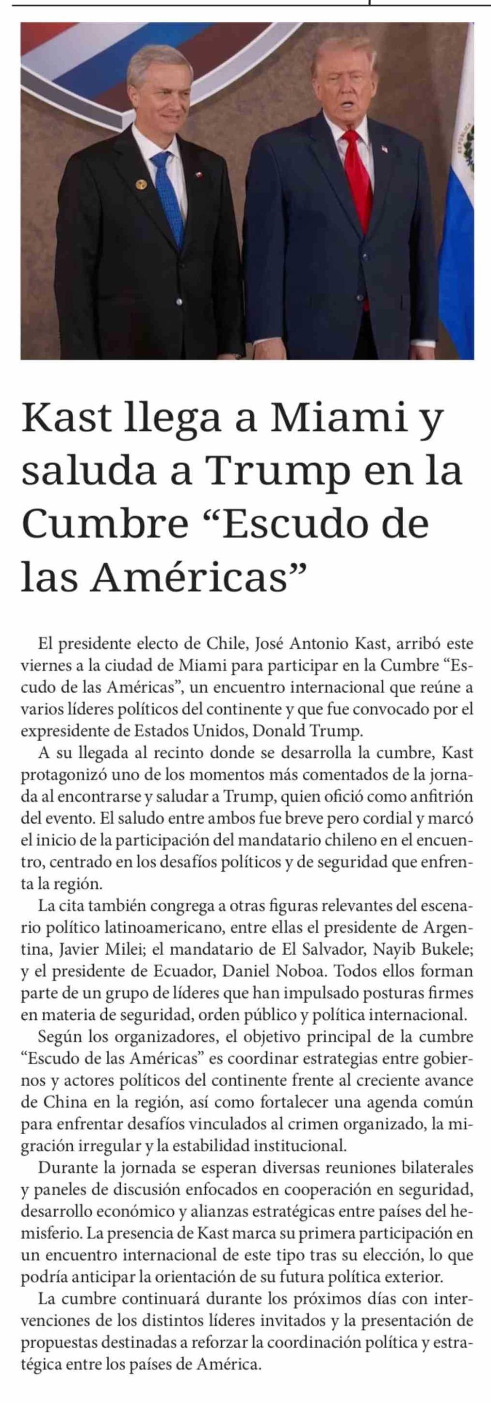 Kast llega a Miami y saluda a Trump en la Cumbre "Escudo de las Américas" 08-03-2026 Diario Chañarcillo |