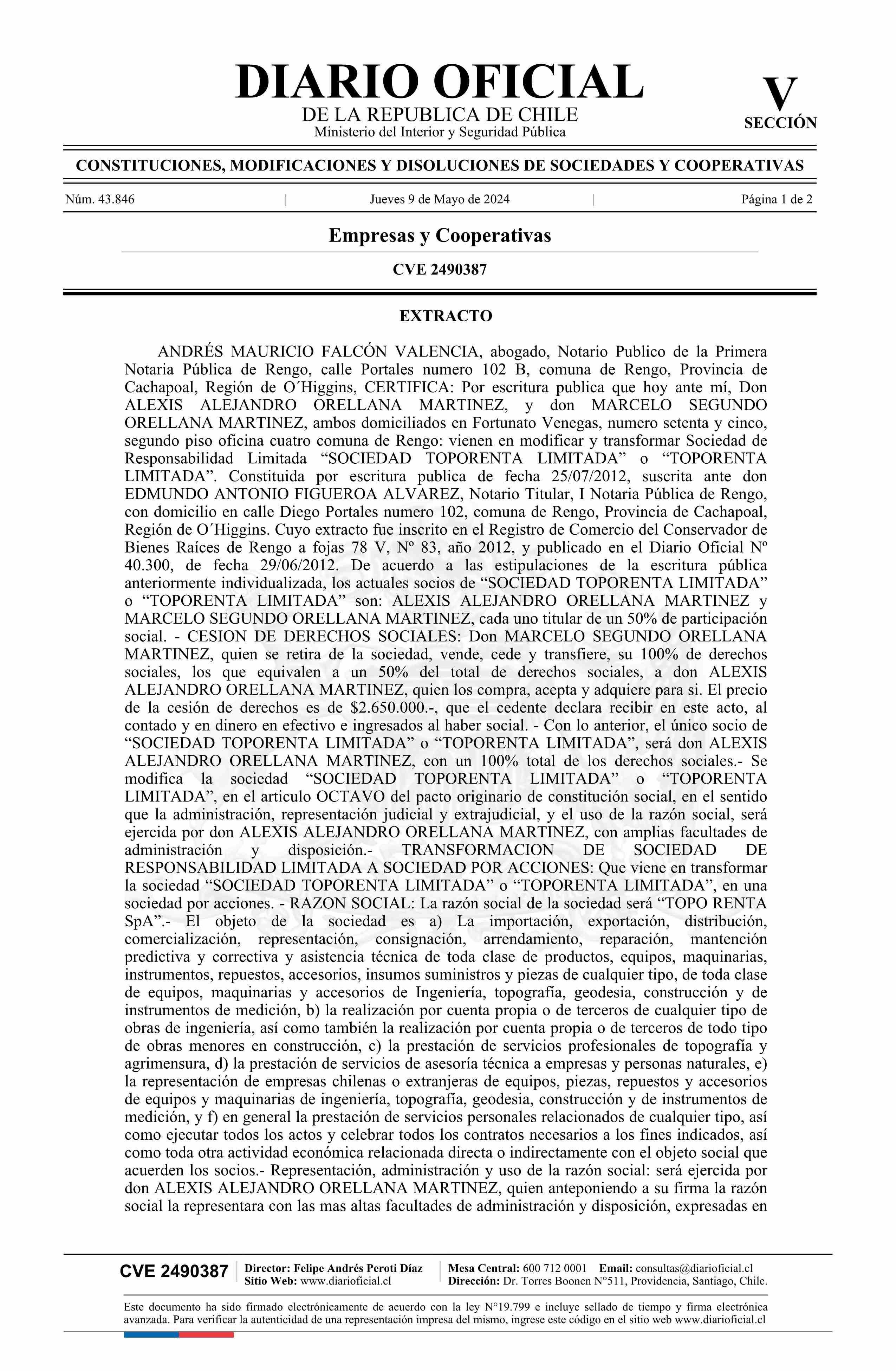 SOCIEDAD TOPORENTA LIMITADA 76.231.162-3* 09-05-2024 Diario Oficial Edición Electrónica |