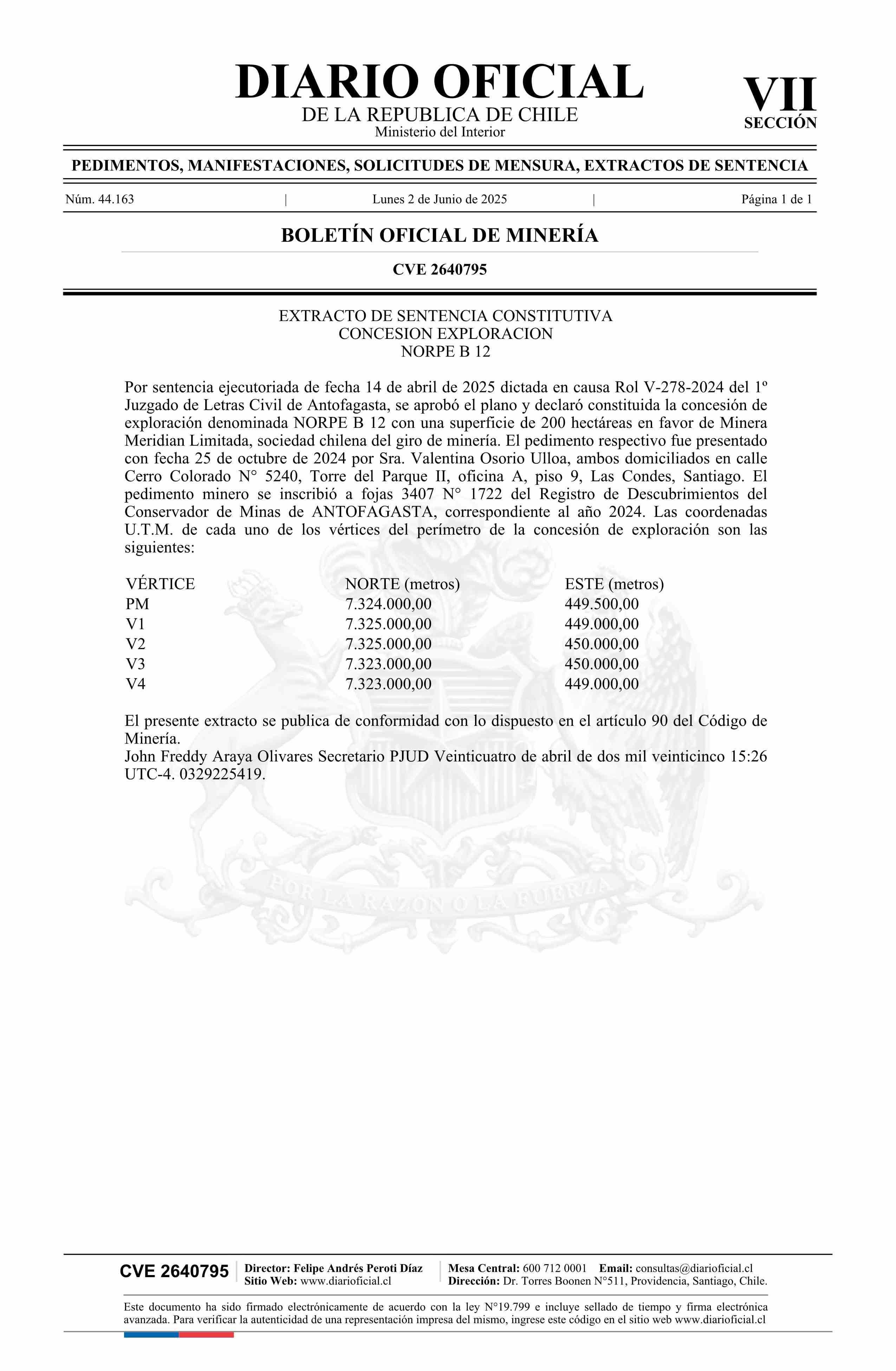 NORPE B 12 / Minera Meridian Limitada 02-06-2025 DIARIO OFICIAL CHILE - BOLETÍN OFICIAL DE MINERÍA |