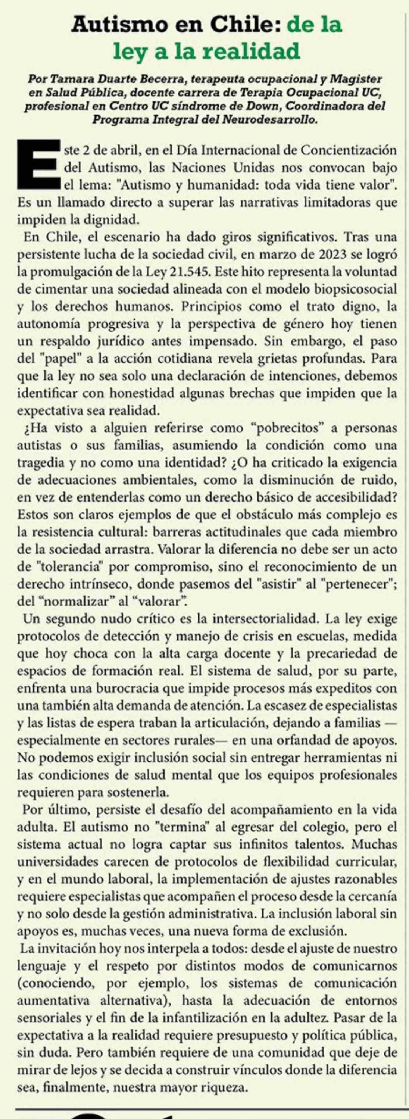 Columnas de Opinión: Autismo en Chile: de la ley a la realidad 02-04-2026 El Heraldo Austral |