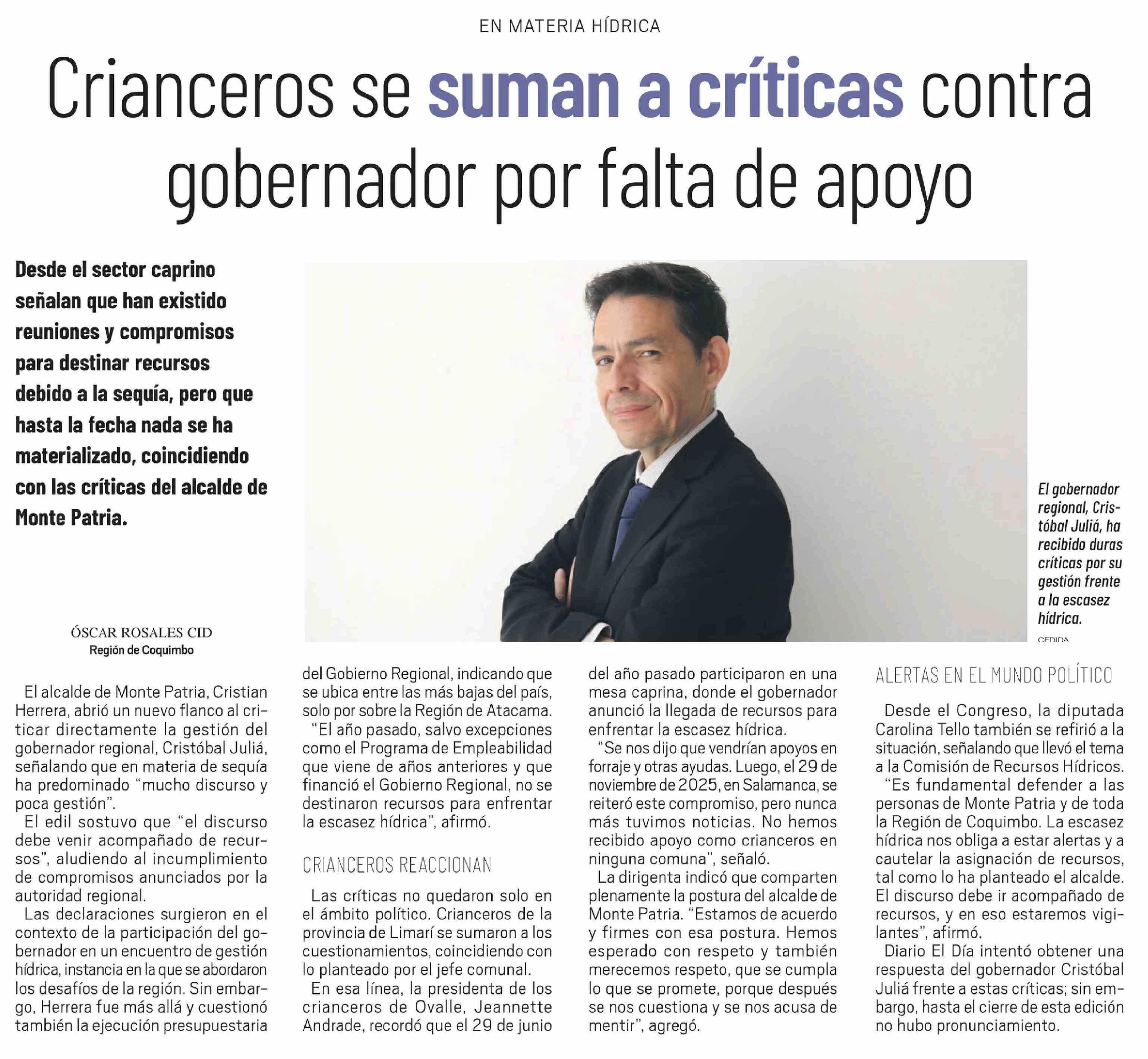 Crianceros se suman a críticas contra gobernador por falta de apoyo 24-03-2026 El Ovallino |