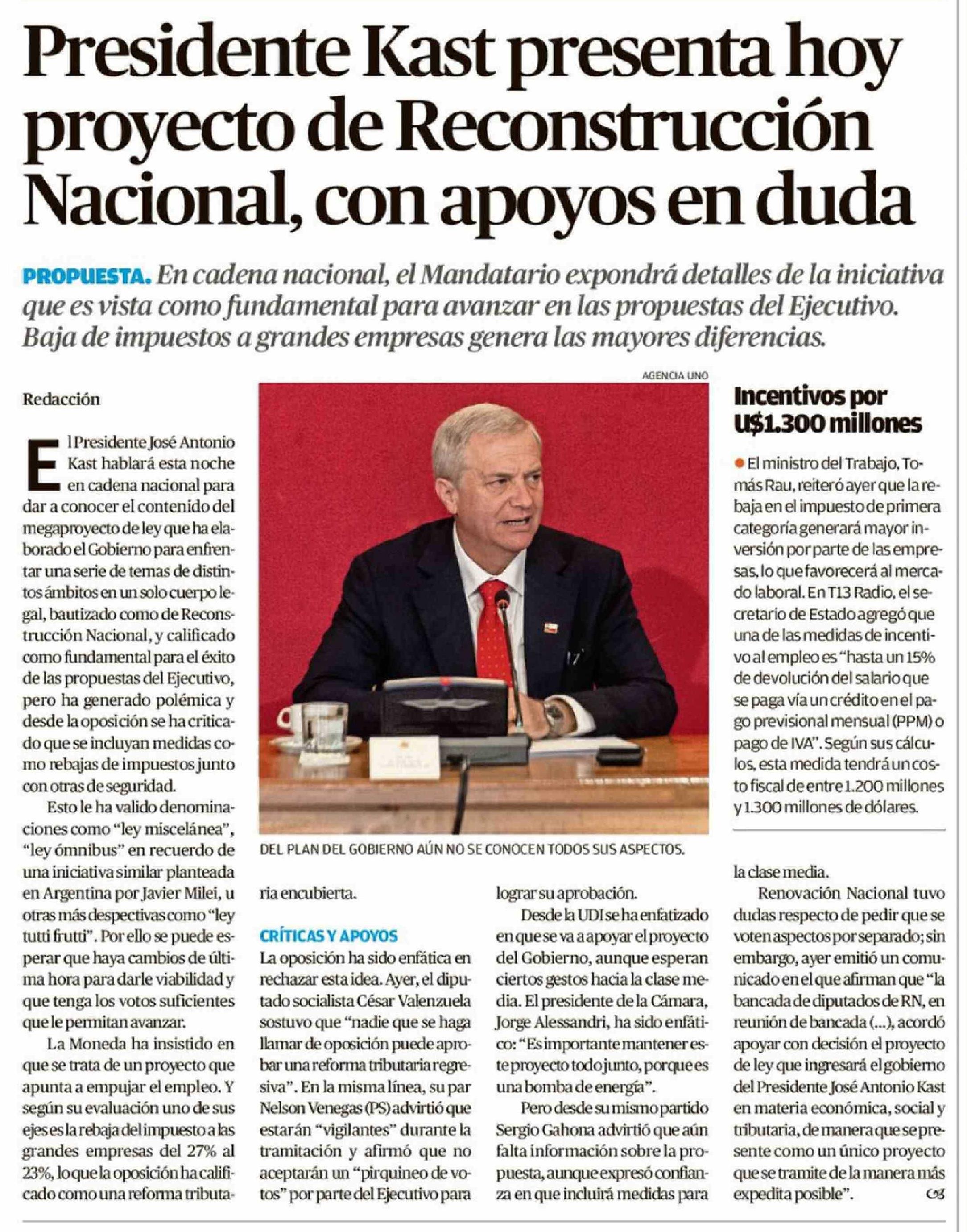 | Título: | Presidente Kast presenta hoy proyecto de Reconstrucción Nacional, con apoyos en duda |