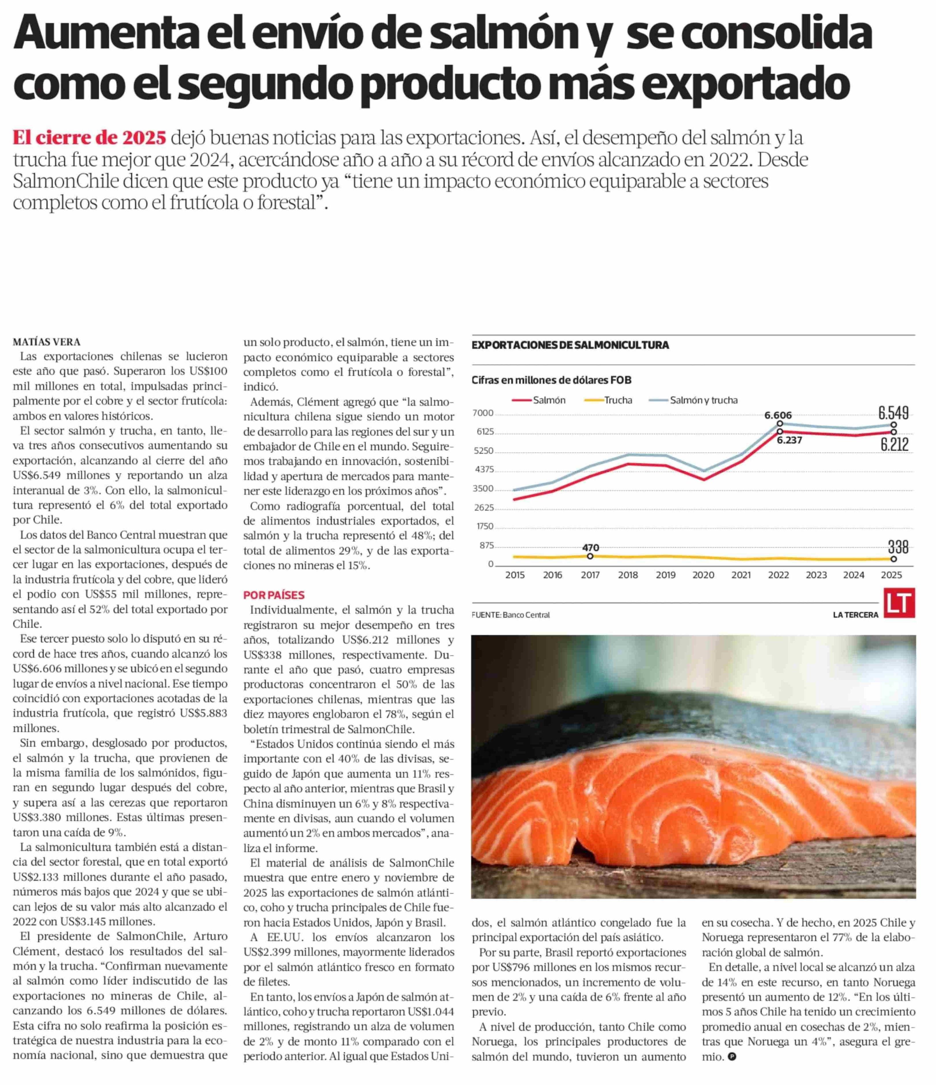 Aumenta el envío de salmón y se consolida como el segundo producto más exportado 12-01-2026 La Tercera |