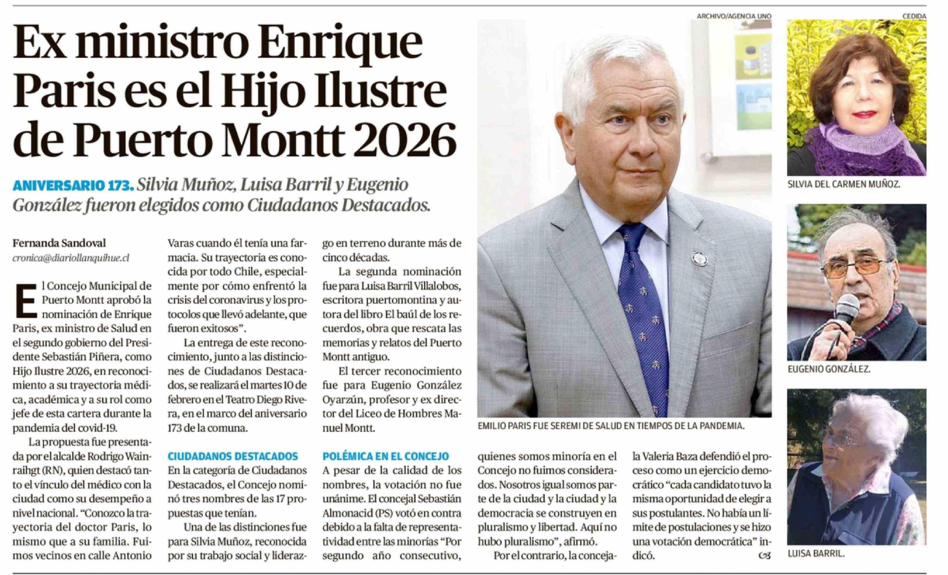 | Título: | Ex ministro Enrique Paris es el Hijo Ilustre de Puerto Montt 2026 |