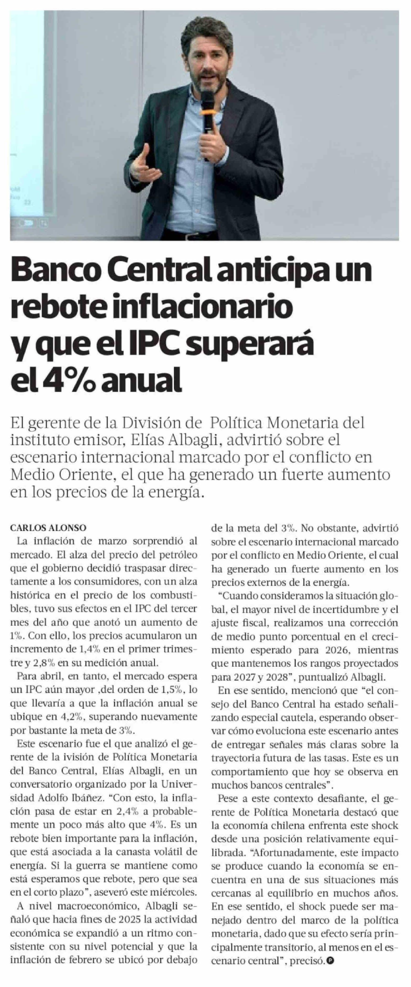 Banco Central anticipa un rebote inflacionario y que el IPC superará el 4% anual 10-04-2026 La Tercera |