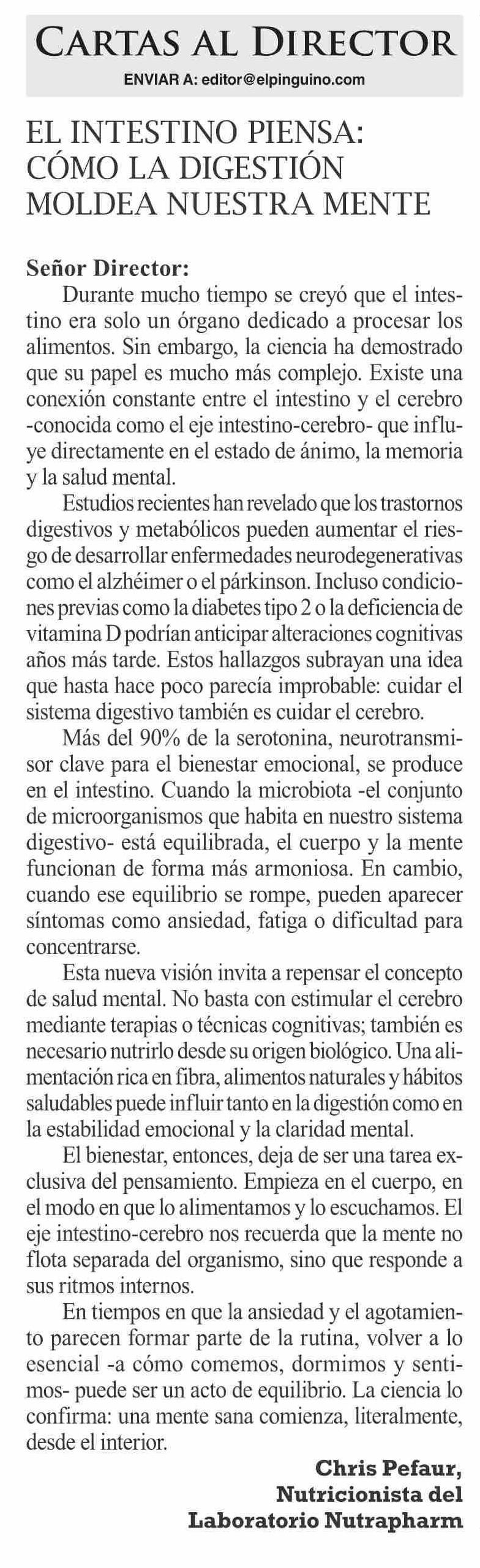 Cartas: EL INTESTINO PIENSA: CÓMO LA DIGESTIÓN MOLDEA NUESTRA MENTE 21-01-2026 El Pingüino |