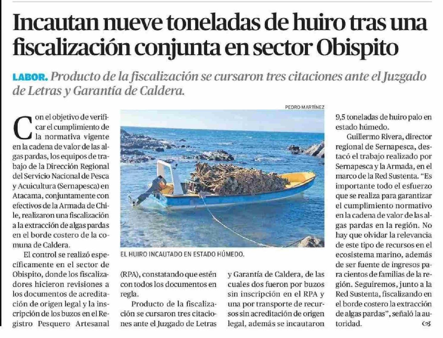 Incautan nueve toneladas de huiro tras una fiscalización conjunta en sector Obispito 15-01-2026 El Diario de Atacama |
