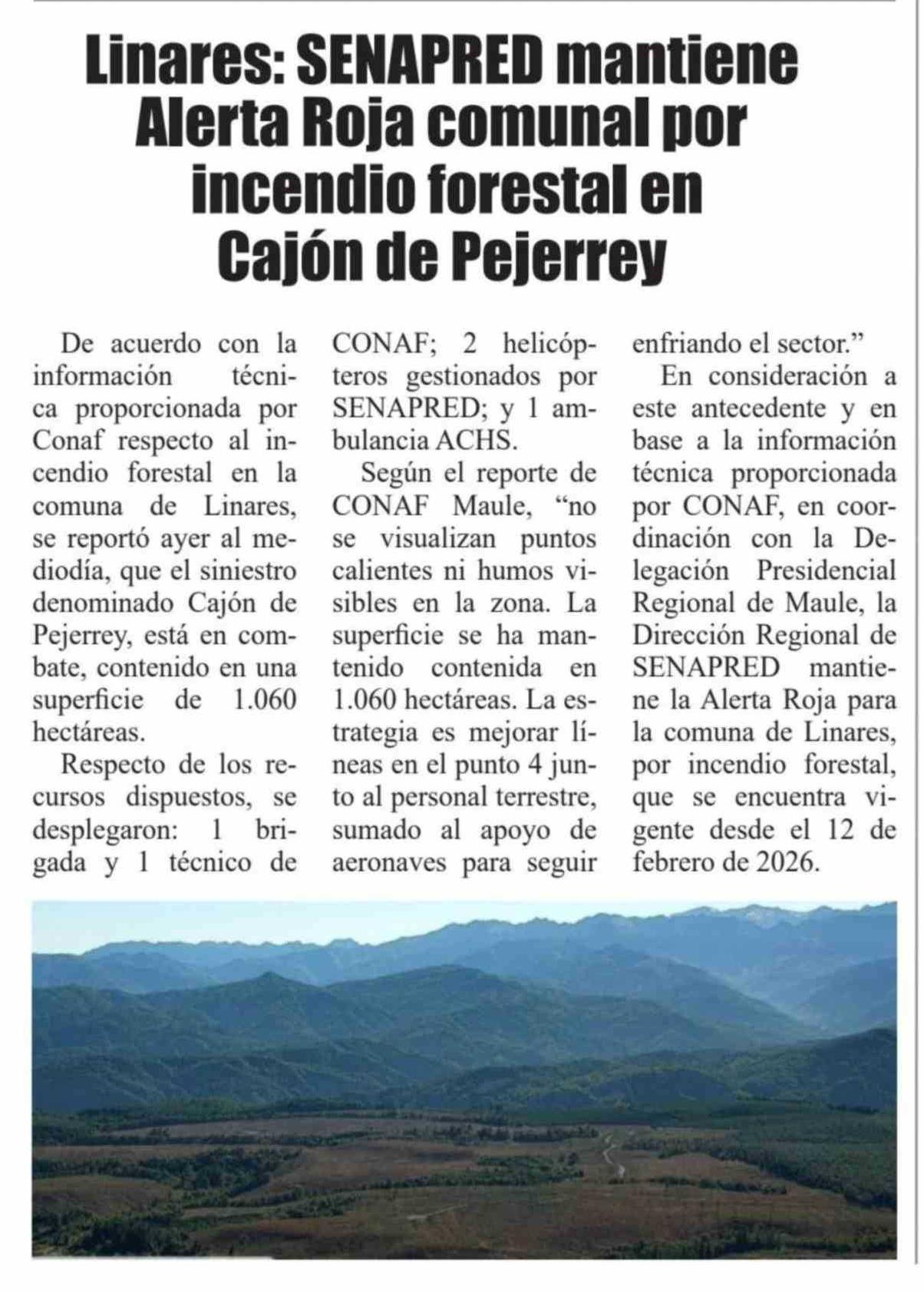 | Título: | Linares: SENAPRED mantiene Alerta Roja comunal por incendio forestal en Cajón de Pejerrey |