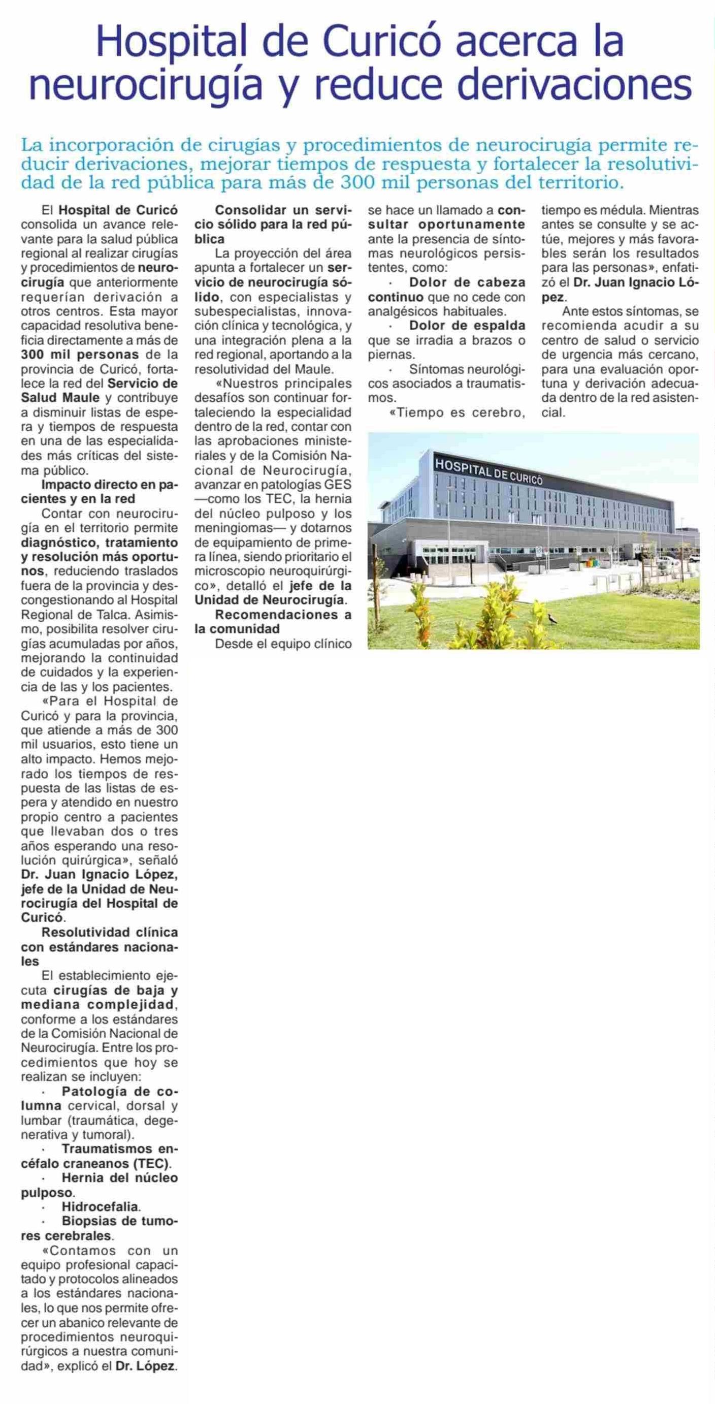 Hospital de Curicó acerca la neurocirugía y reduce derivaciones 23-01-2026 Maule Hoy |