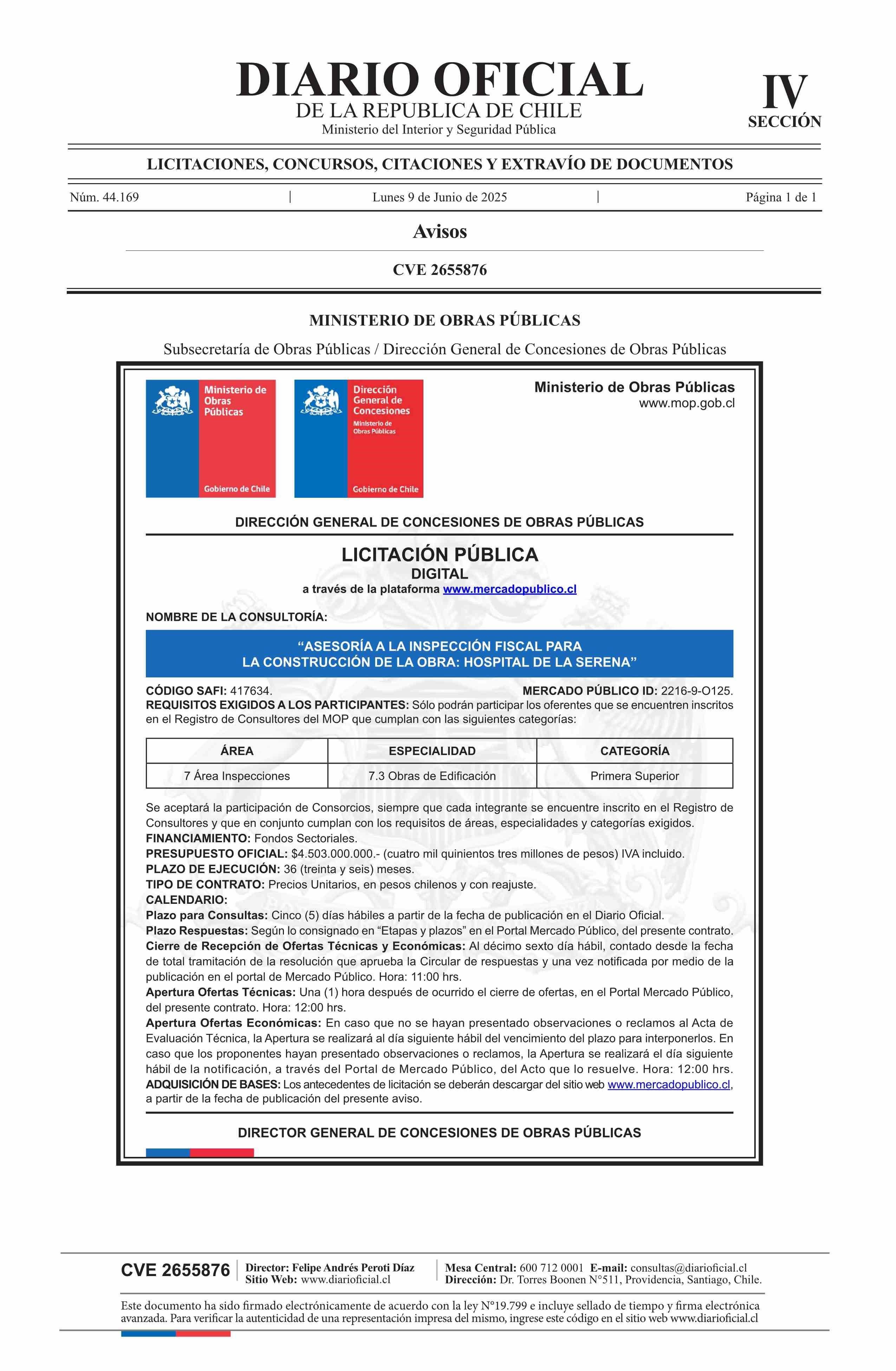 AVISO LICITACIONES: Asesoría a la Inspección Fiscal para la Construcción de la Obra: Hospital de La Serena 09-06-2025 Diario Oficial Edición Electrónica |