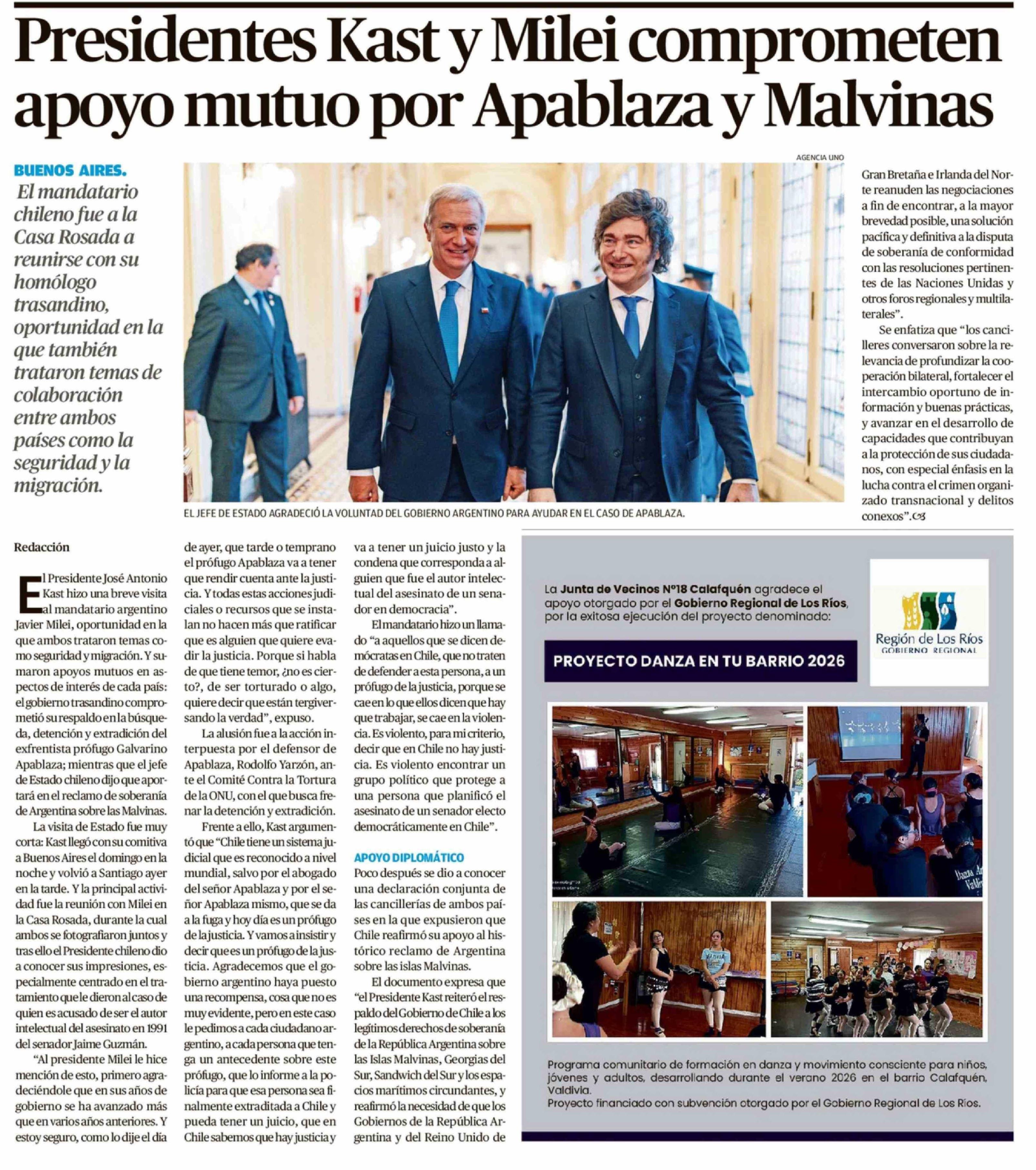 Título: Presidentes Kast y Milei comprometen apoyo mutuo por Apablaza y Malvinas