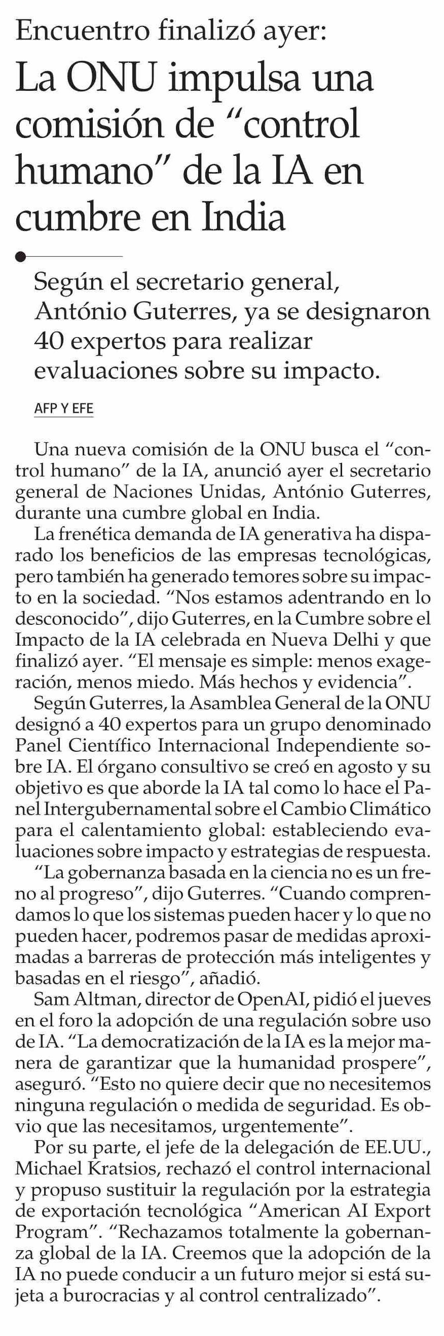 Título: La ONU impulsa una comisión de “control humano” de la IA en cumbre en India