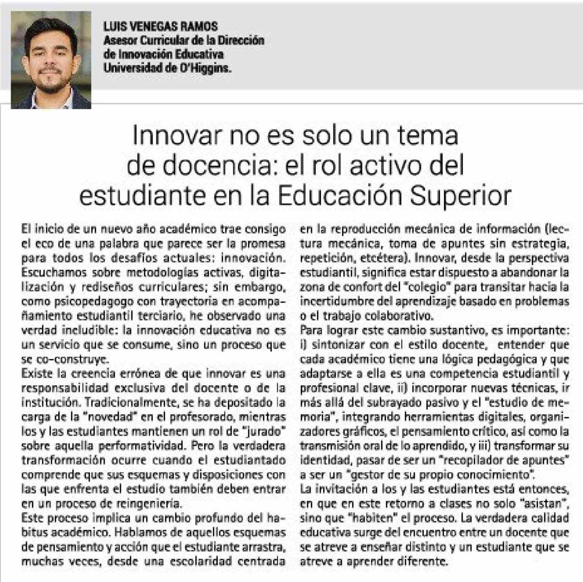 Columnas de Opinión: Innovar no es solo un tema de docencia: el rol activo del estudiante en la Educación Superior 18-03-2026 El Rancagüino |