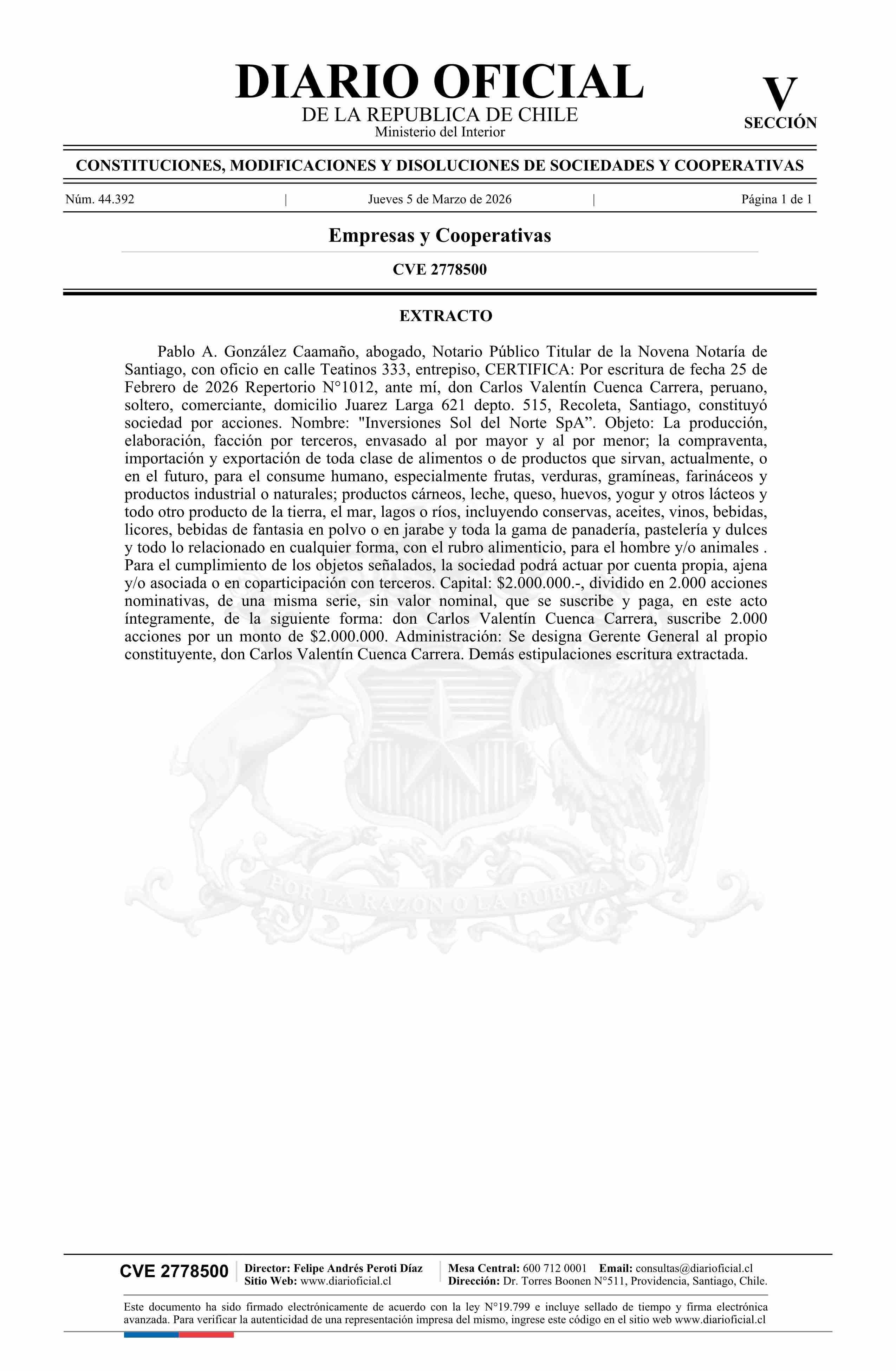 Inversiones Sol del Norte SpA 05-03-2026 Diario Oficial Edición Electrónica |