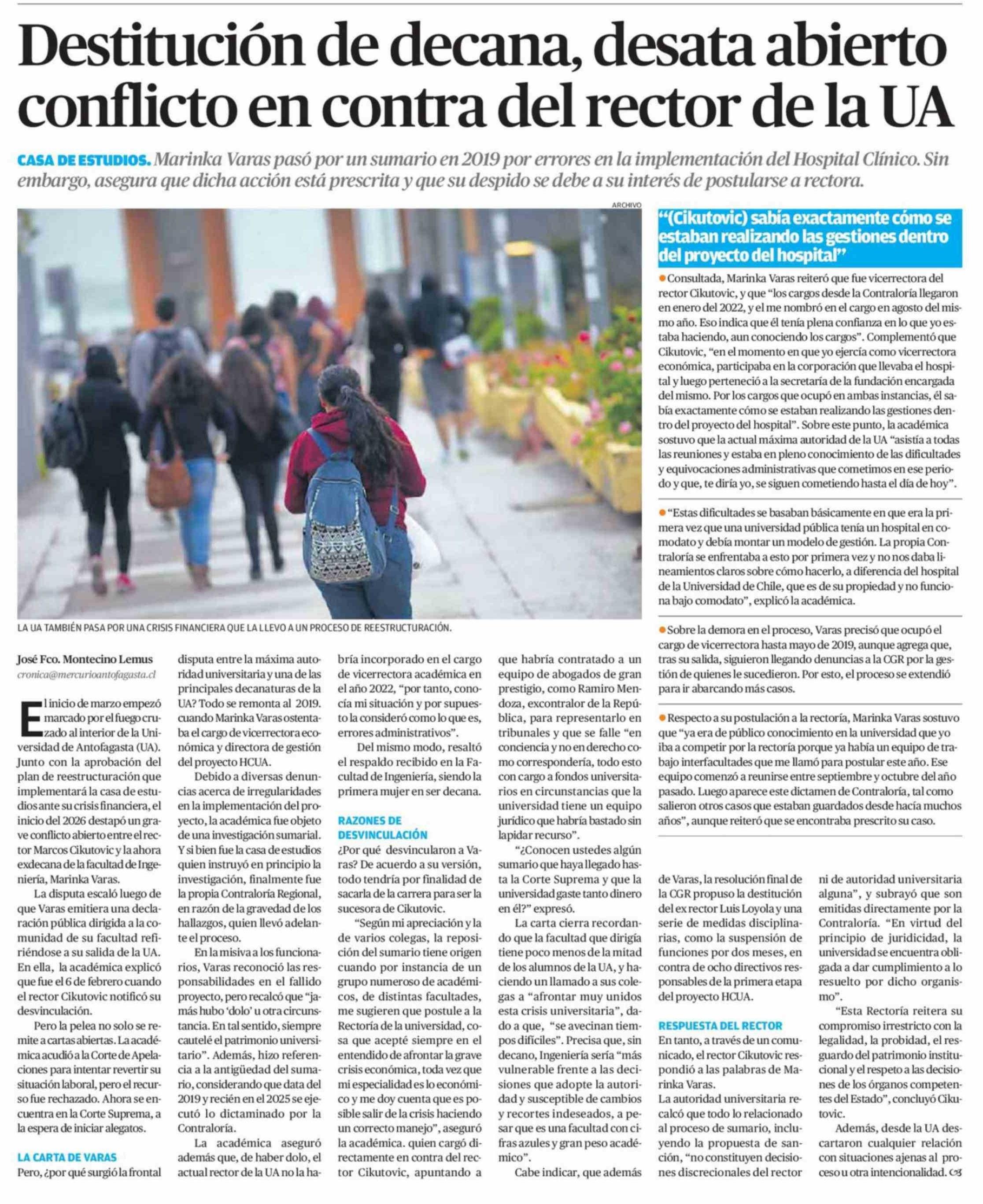 Destitución de decana, desata abierto conflicto en contra del rector de la UA 05-03-2026 El Mercurio de Calama |