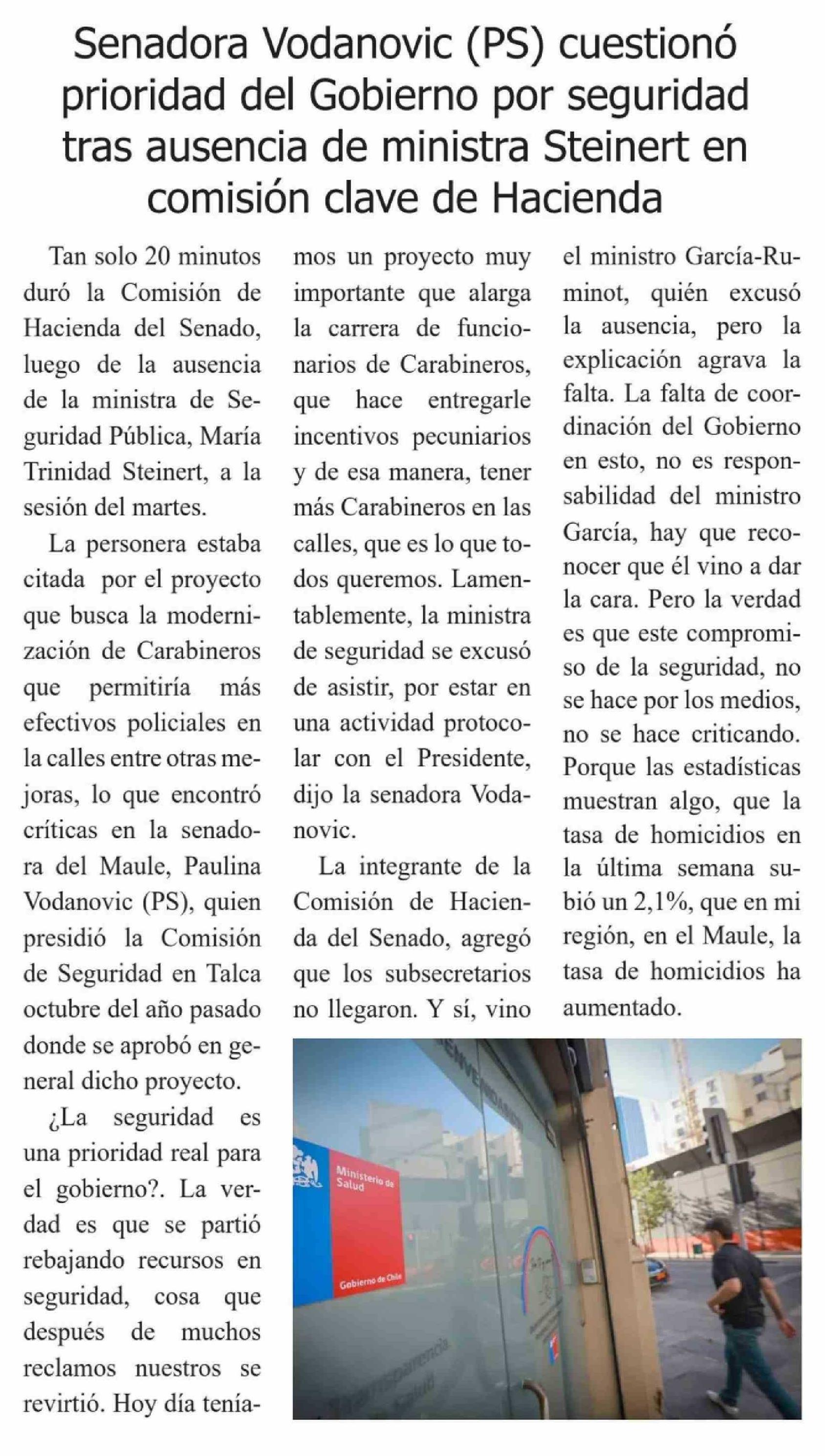 | Título: | Senadora Vodanovic (PS) cuestionó prioridad del Gobierno por seguridad tras ausencia de ministra Steinert en comisión clave de Hacienda |