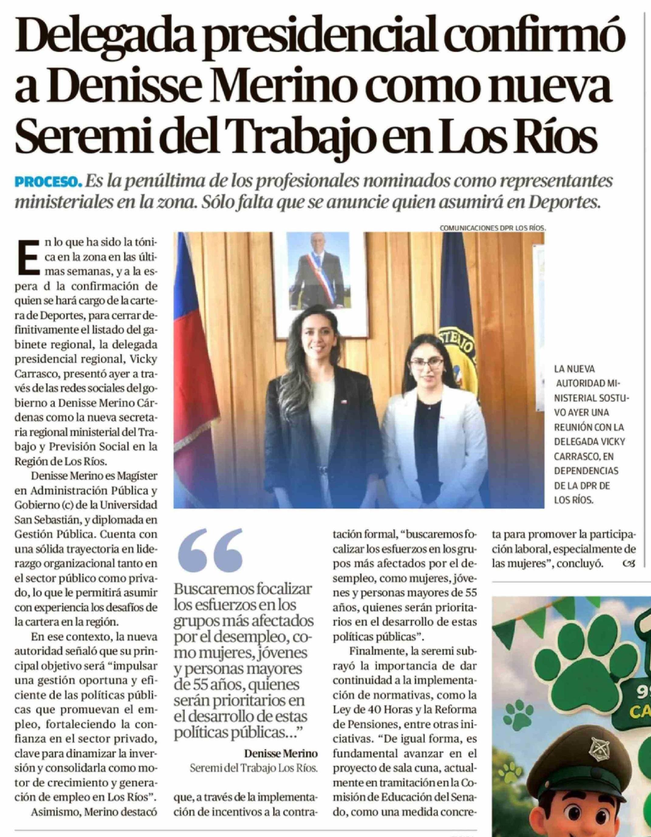 | Título: | Delegada presidencial confirmó a Denisse Merino como nueva Seremi del Trabajo en Los Ríos |