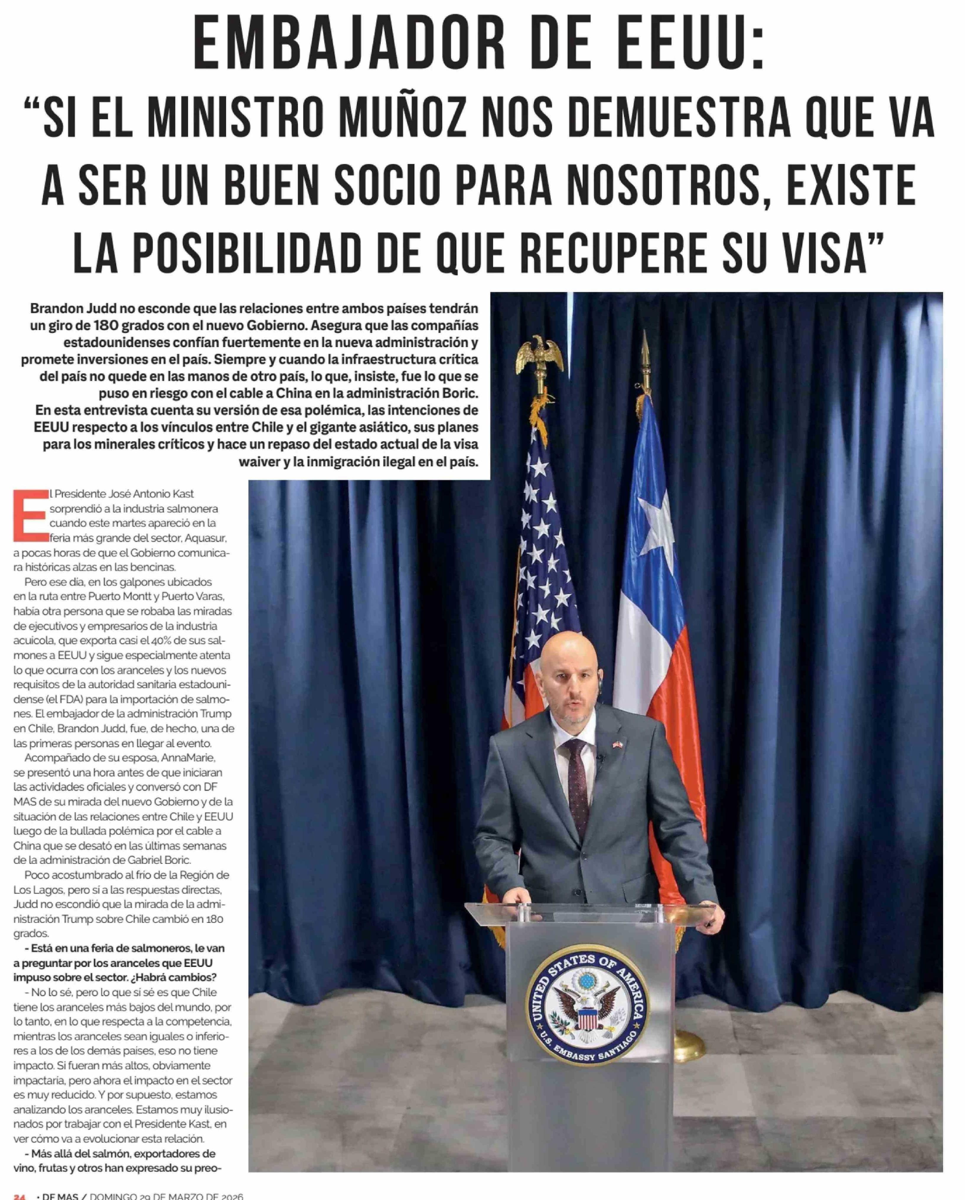 EMBAJADOR DE EEUU: "SIEL MINISTRO MUÑOZ NOS DEMUESTRA QUE VAA SER UN BUEN SOCIO PARA NOSOTROS, EXISTE LA POSIBILIDAD DE QUE RECUPERE SU VISA" 29-03-2026 Diario Financiero |