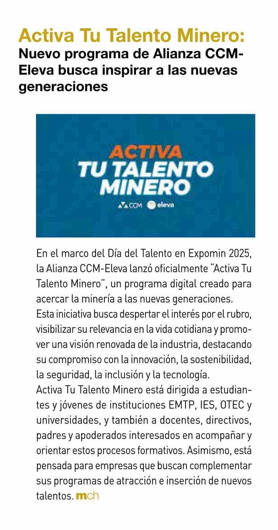 Activa Tu Talento Minero: Nuevo programa de Alianza CCM- Eleva busca inspirar a las nuevas generaciones 27-05-2025 Revista Minería Chilena |