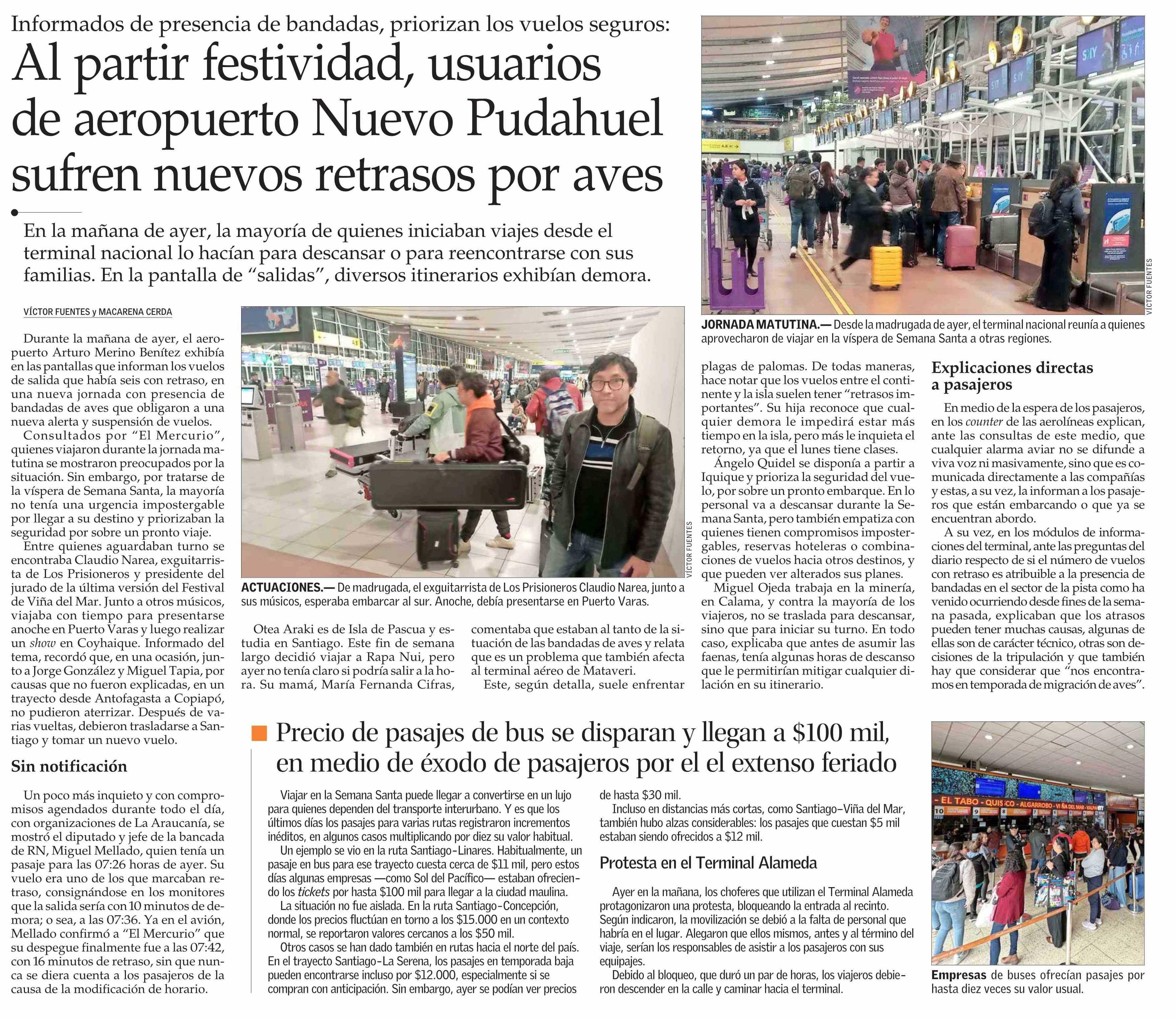 Al partir festividad, usuarios de aeropuerto Nuevo Pudahuel sufren nuevos retrasos por aves 18-04-2025 El Mercurio |