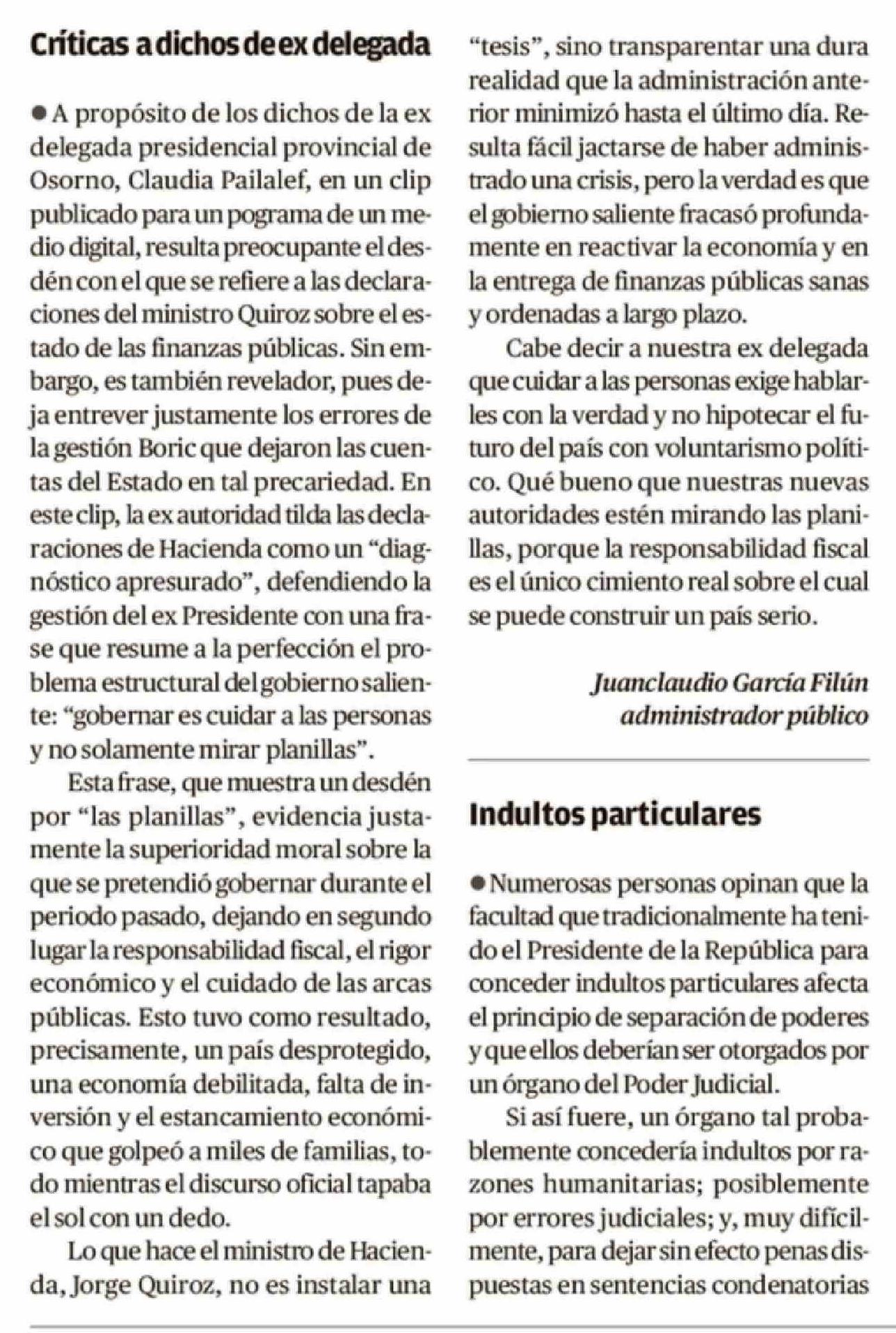 Cartas: Críticas a dichos de ex delegada 20-03-2026 El Austral de Osorno |