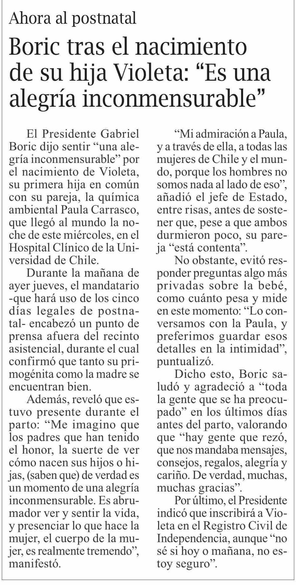 | Título: | Boric tras el nacimiento de su hija Violeta: “Es una alegría inconmensurable” |