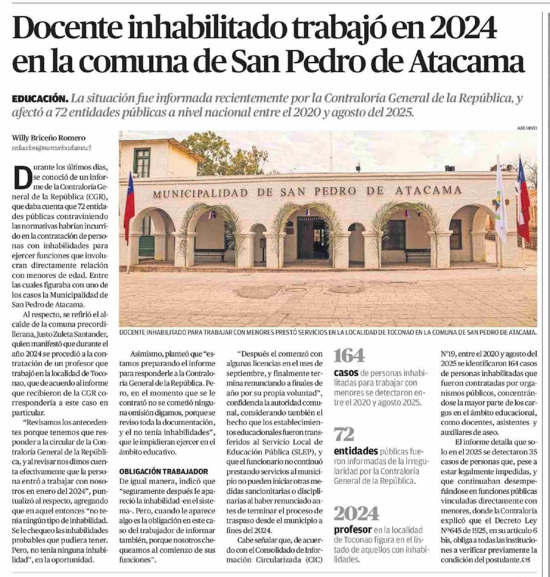 Título: Docente inhabilitado trabajó en 2024 en la comuna de San Pedro de Atacama