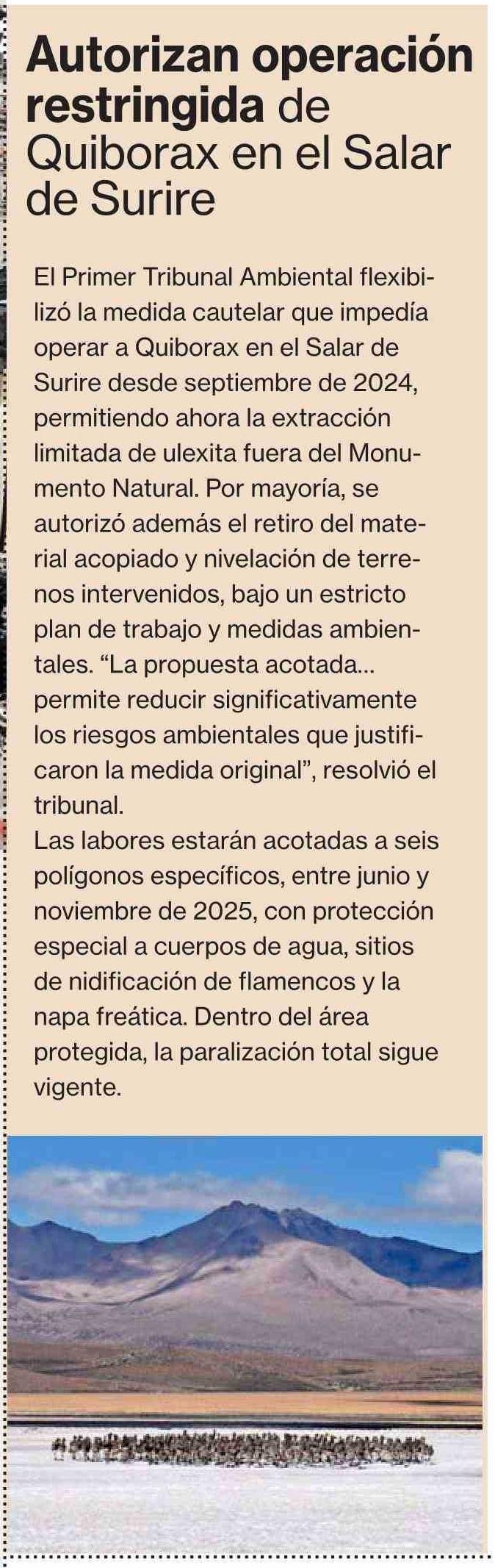 Autorizan operación restringida de Quiborax en el Salar de Surire 30-05-2025 La Segunda |