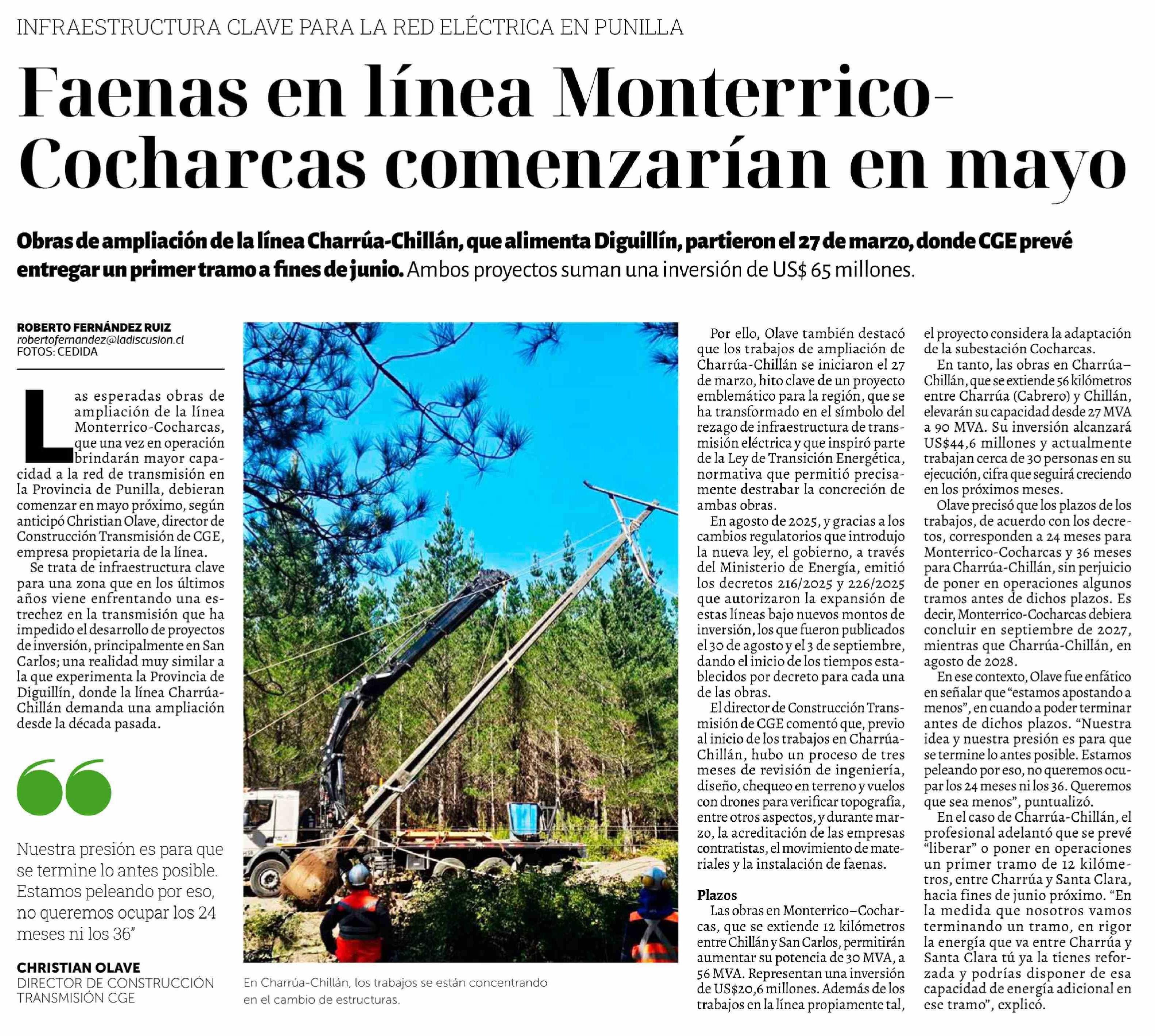 Faenas en línea MonterricoCocharcas comenzarían en mayo 21-04-2026 La Discusión |