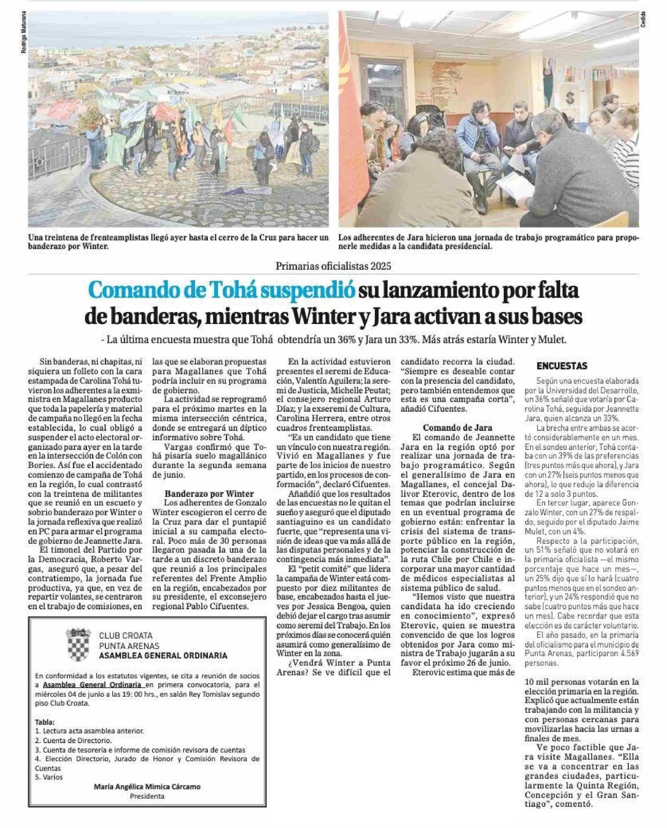 Comando de Tohá suspendió su lanzamiento por falta de banderas, mientras Winter y Jara activan a sus bases 01-06-2025 El Magallanes |