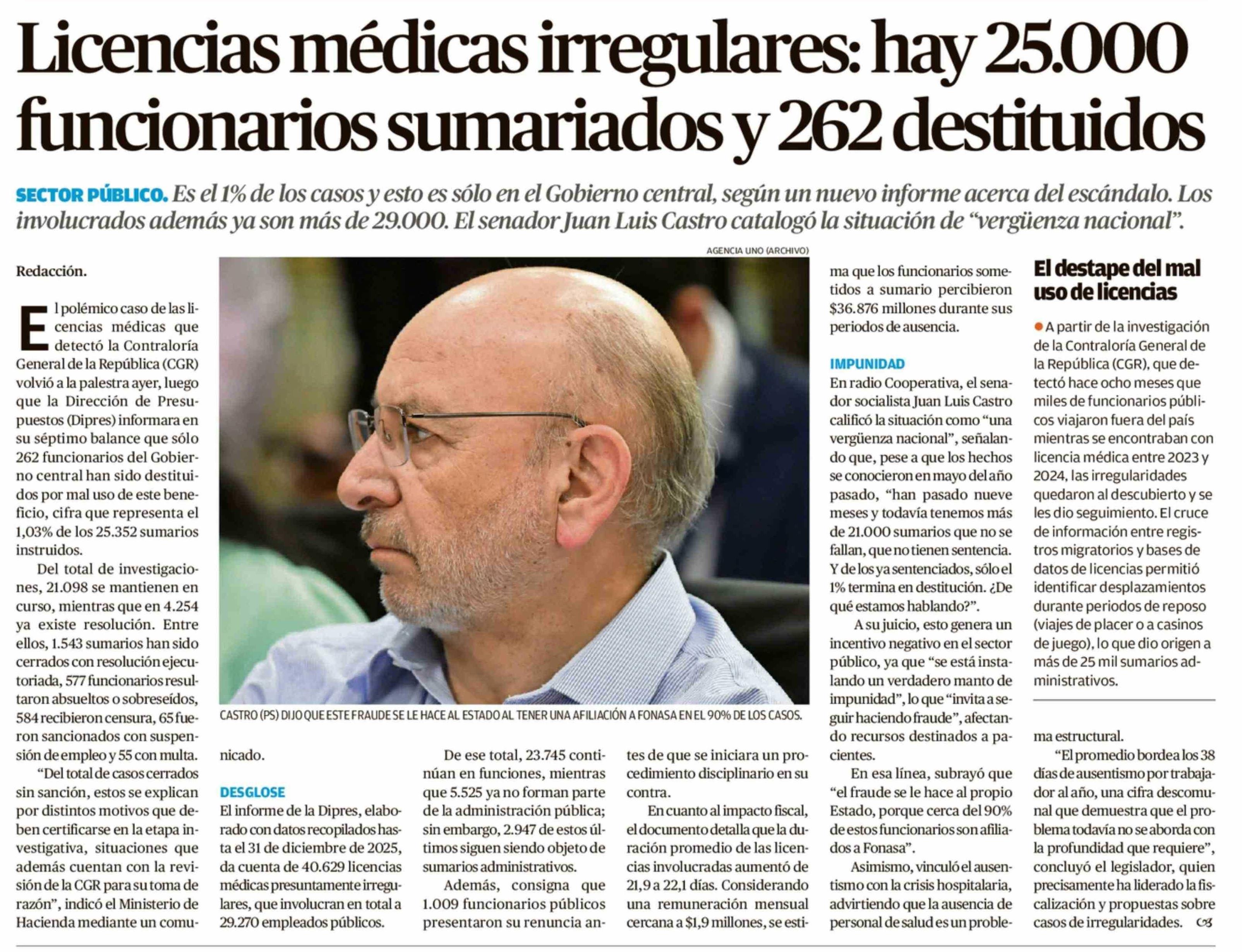 Licencias médicas irregulares: hay 25.000 funcionarios sumariados y 262 destituidos 06-02-2026 El Mercurio de Valparaíso |