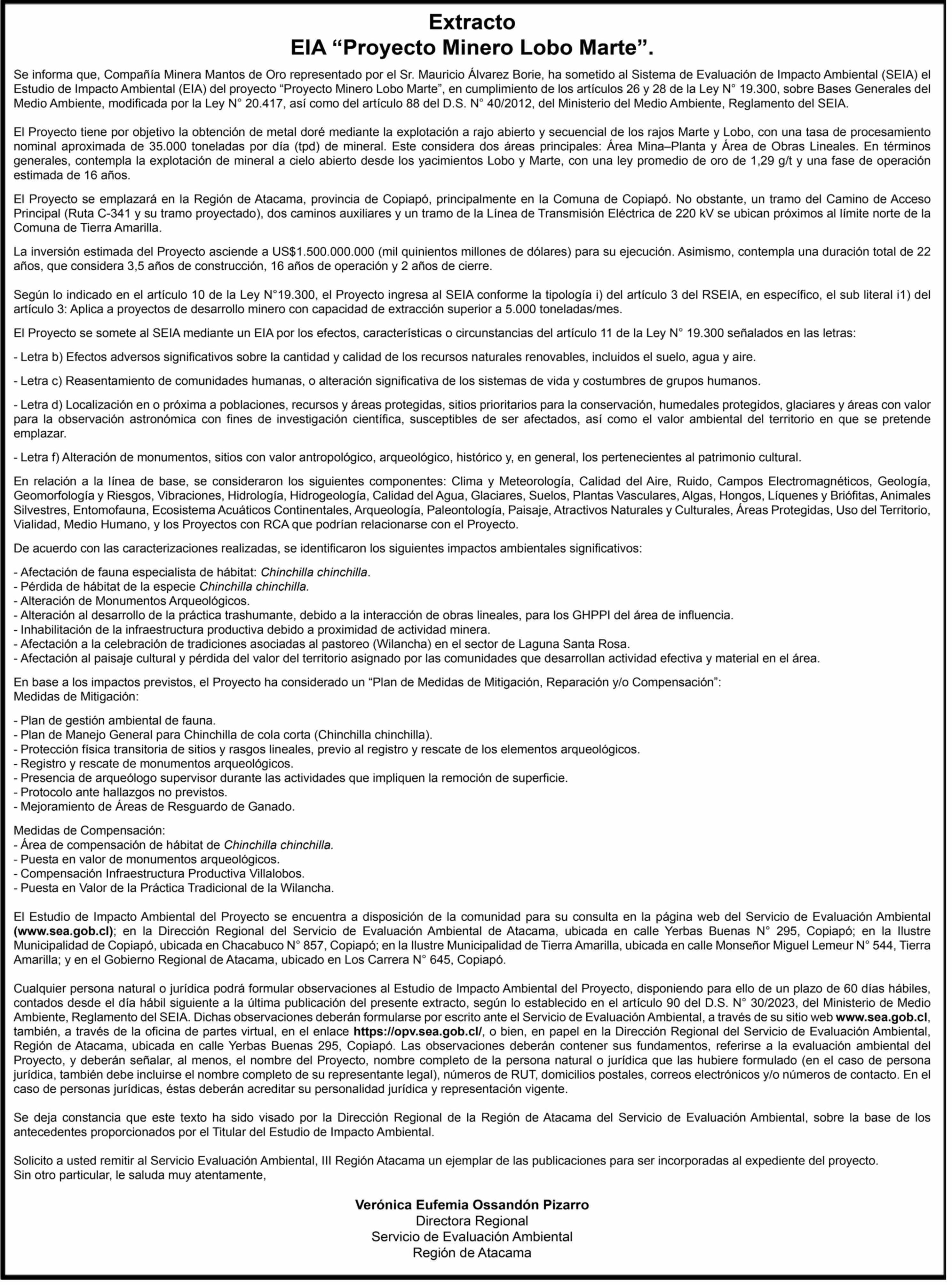 Extracto EIA "Proyecto Minero Lobo Marte". 24-04-2026 Diario Chañarcillo |