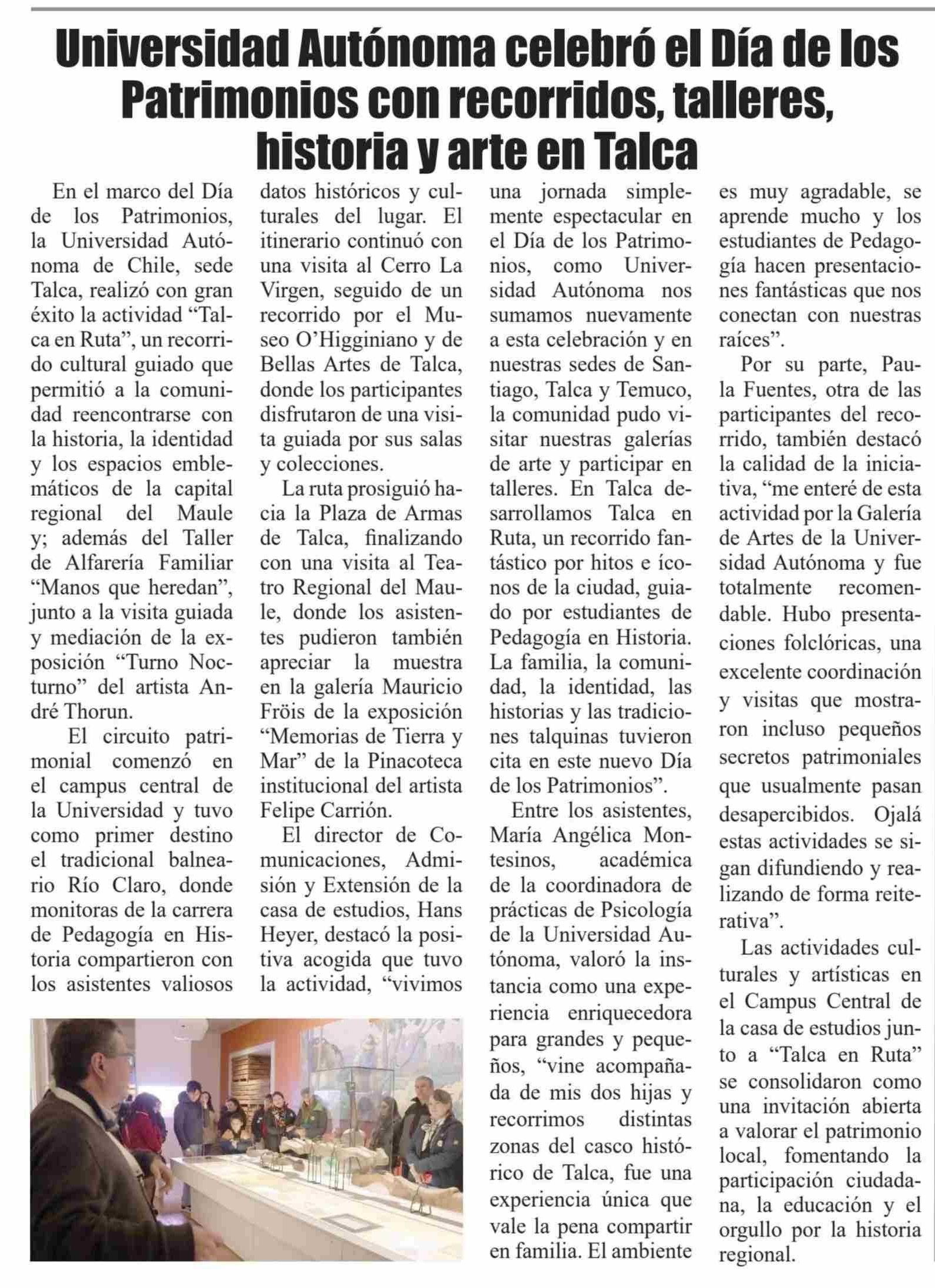 Universidad Autónoma celebró el Día de los Patrimonios con recorridos, talleres, historia y arte en Talca 27-05-2025 El Heraldo |
