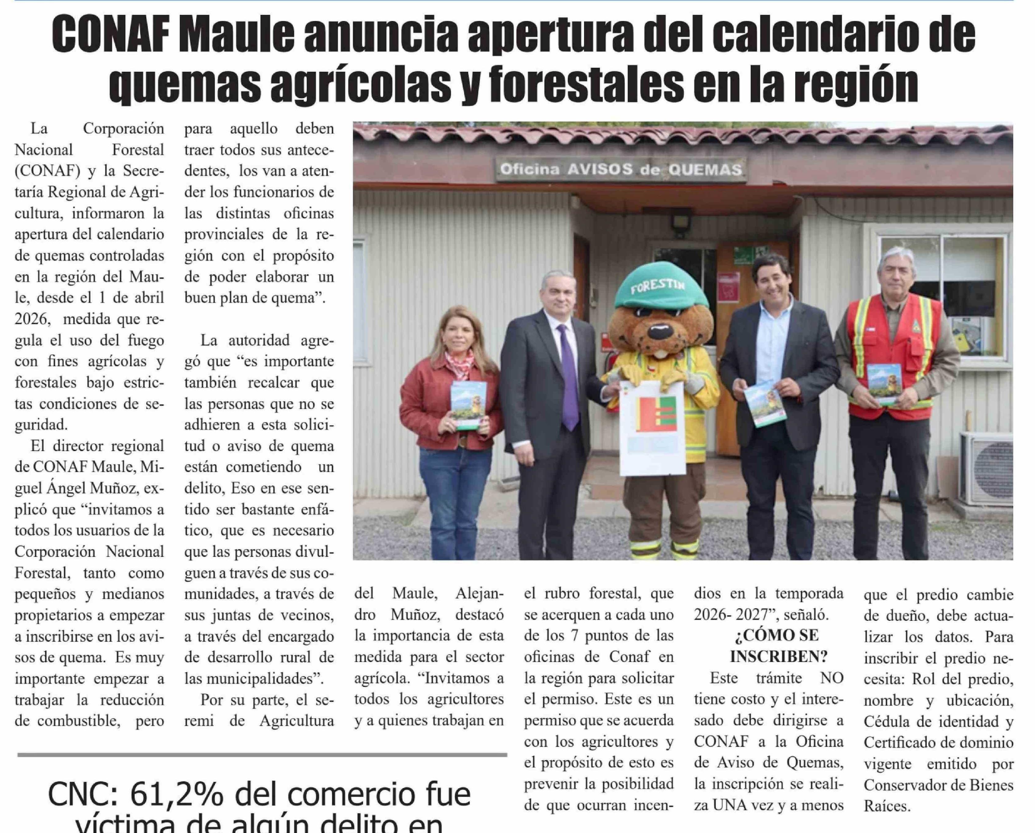 CONAF Maule anuncia apertura del calendario de quemas agrícolas y forestales en la región 08-04-2026 El Heraldo |