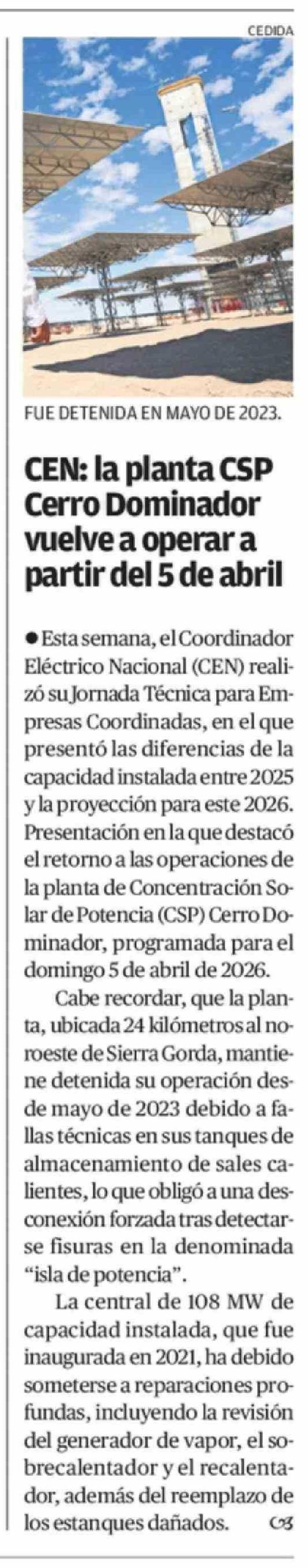 CEN: la planta CSP Cerro Dominador vuelve a operar a partir del 5 de abril 26-03-2026 El Mercurio de Antofagasta |