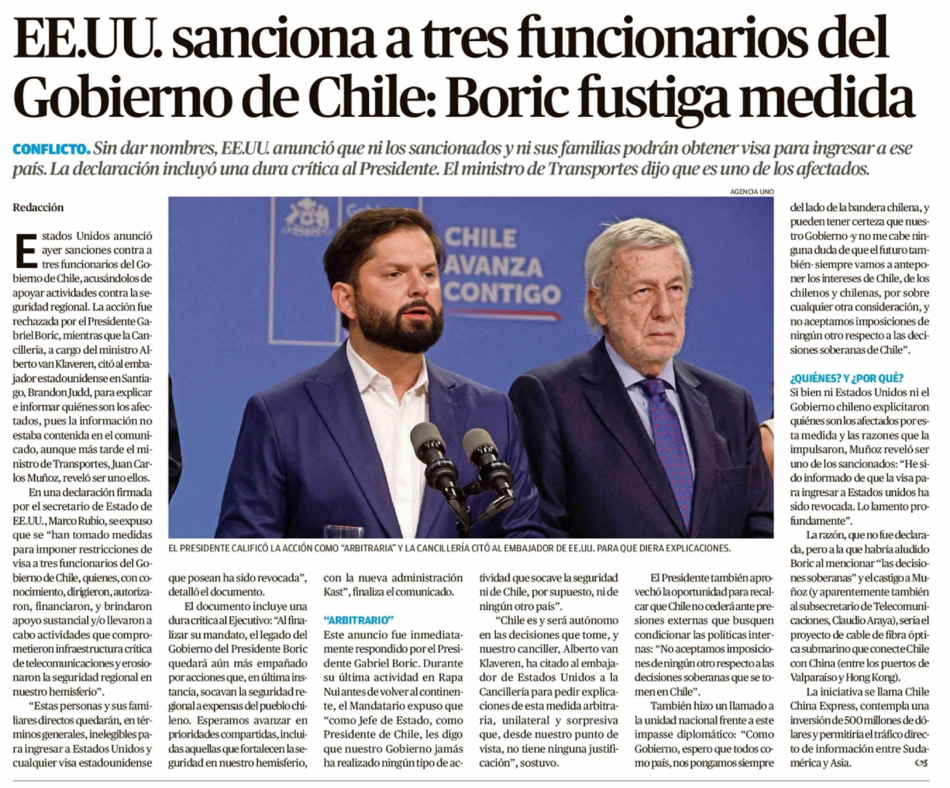 EE.UU. sanciona a tres funcionarios del Gobierno de Chile: Boric fustiga medida 21-02-2026 El Mercurio de Valparaíso |