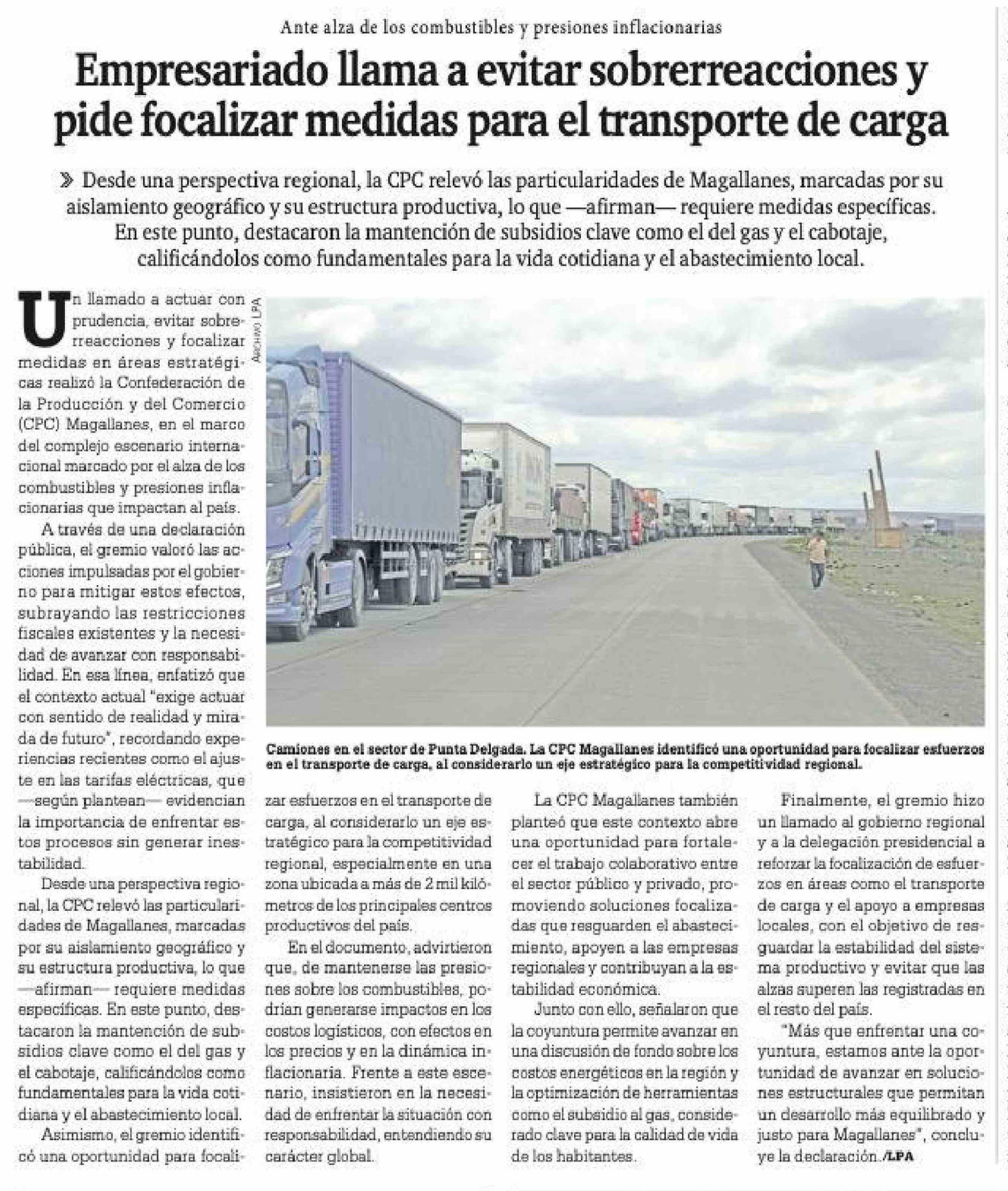 Empresariado llama a evitar sobrerreacciones y pide focalizar medidas para el transporte de carga 30-03-2026 La Prensa Austral |