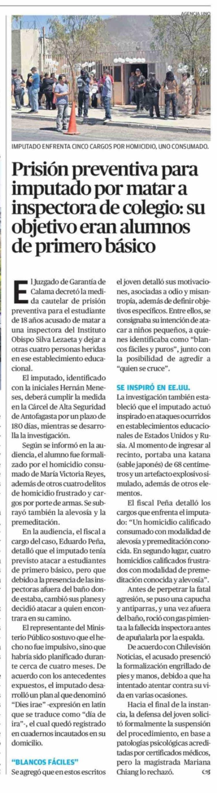 Título: Prisión preventiva para imputado por matar a inspectora de colegio: su objetivo eran alumnos de primero básico