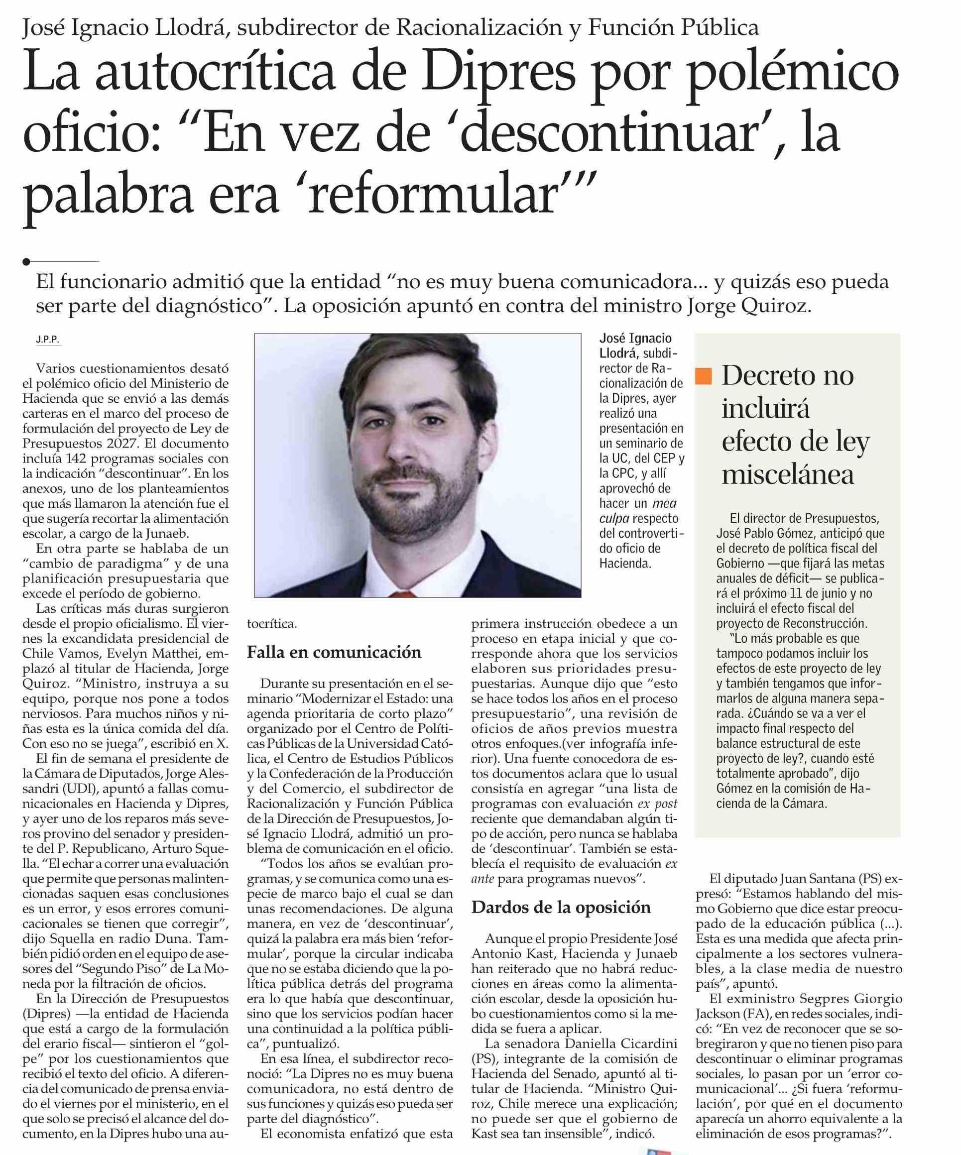 La autocrítica de Dipres por polémico oficio: “En vez de *descontinuar”, la palabra era “reformular” 28-04-2026 El Mercurio |