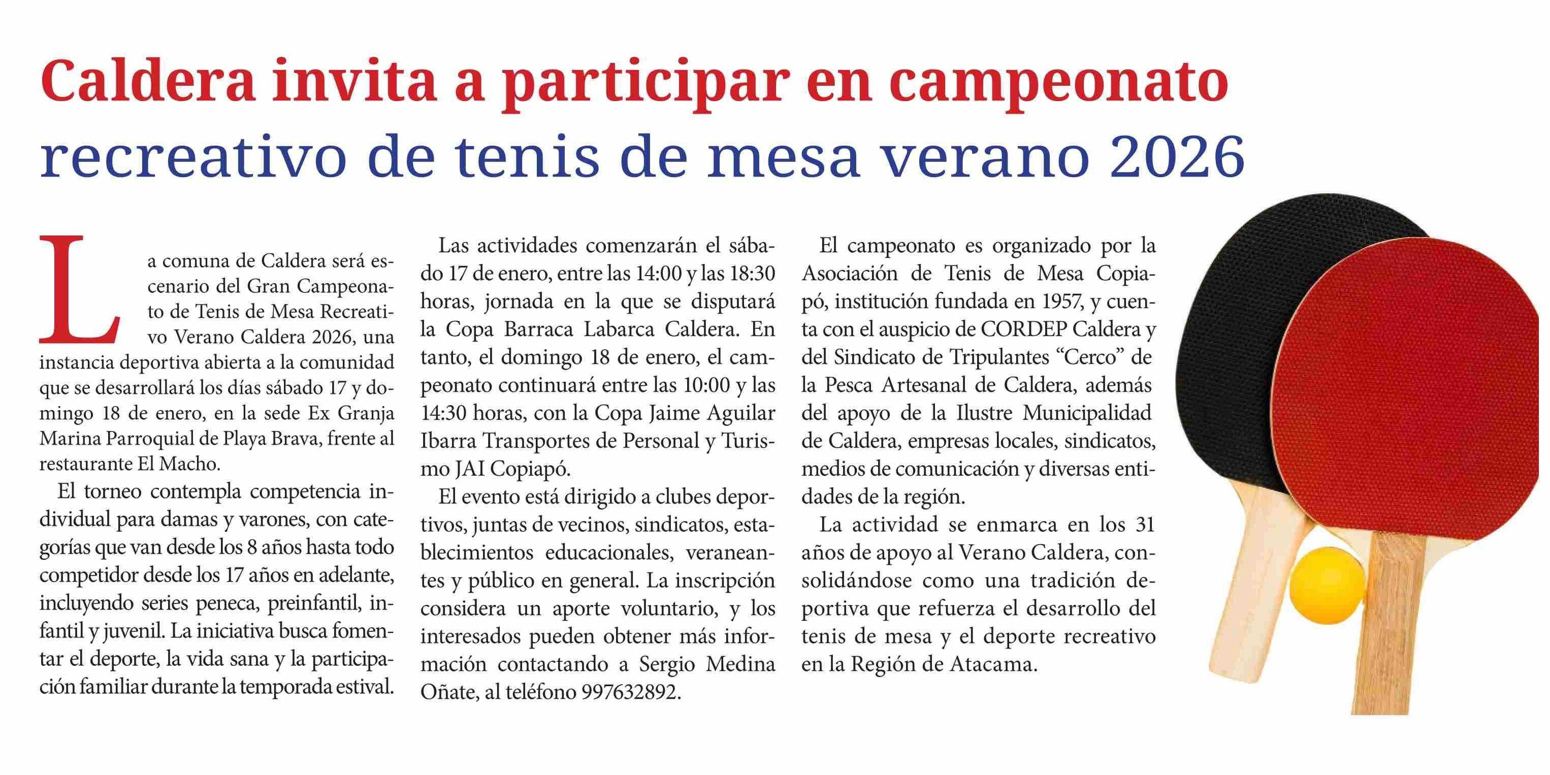 Caldera invita a participar en campeonato recreativo de tenis de mesa verano 2026 13-01-2026 Diario Chañarcillo |