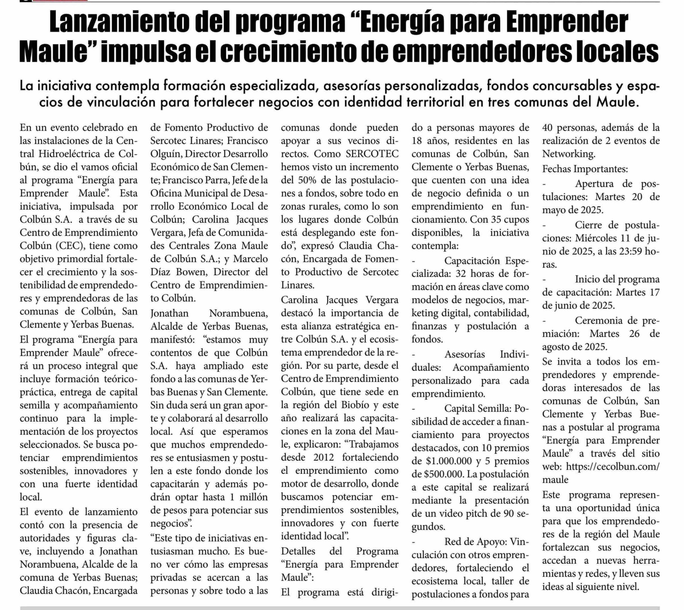 | Título: | Lanzamiento del programa “Energía para Emprender Maule” impulsa el crecimiento de emprendedores locales |