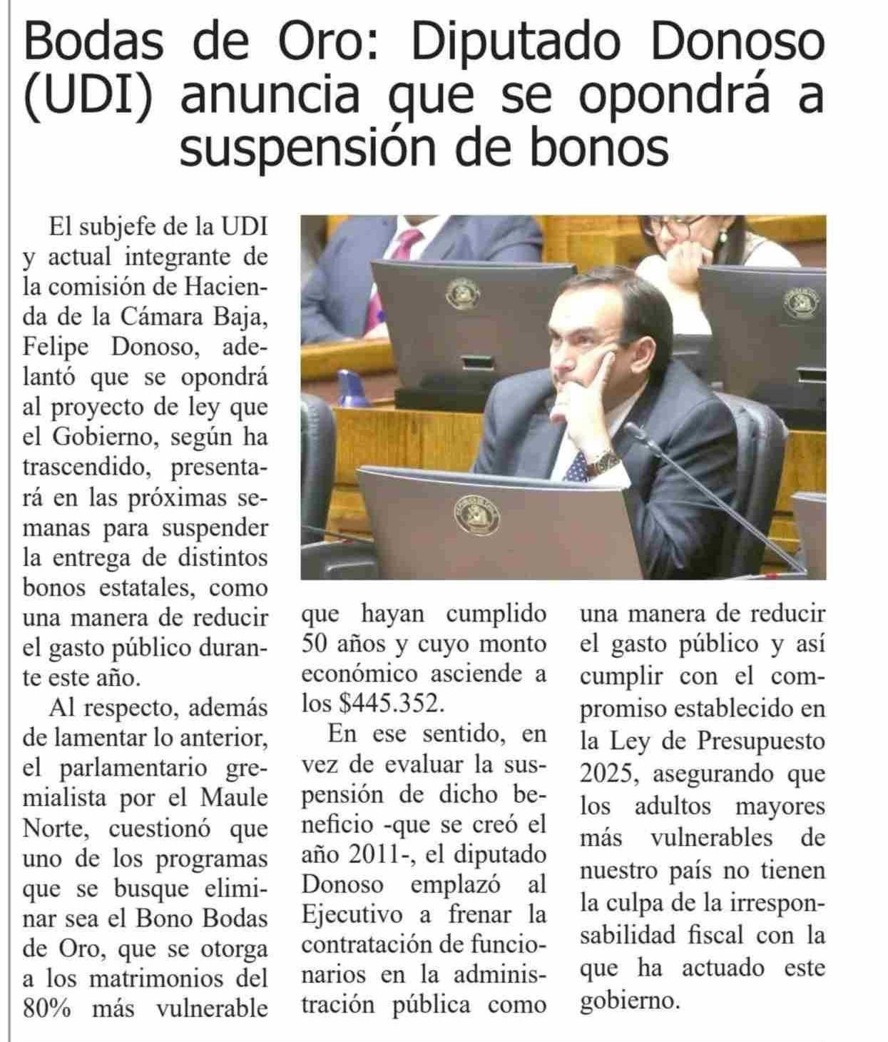 Bodas de Oro: Diputado Donoso (UDI) anuncia que se opondrá a suspensión de bonos 24-05-2025 El Heraldo |