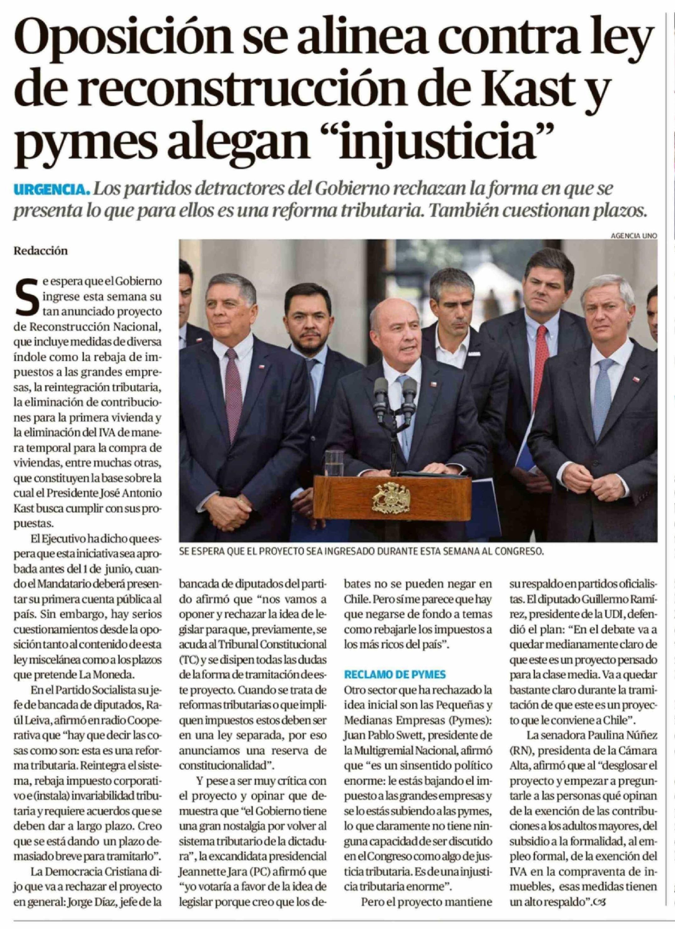 | Título: | Oposición se alinea contra ley de reconstrucción de Kast y pymes alegan "injusticia" |