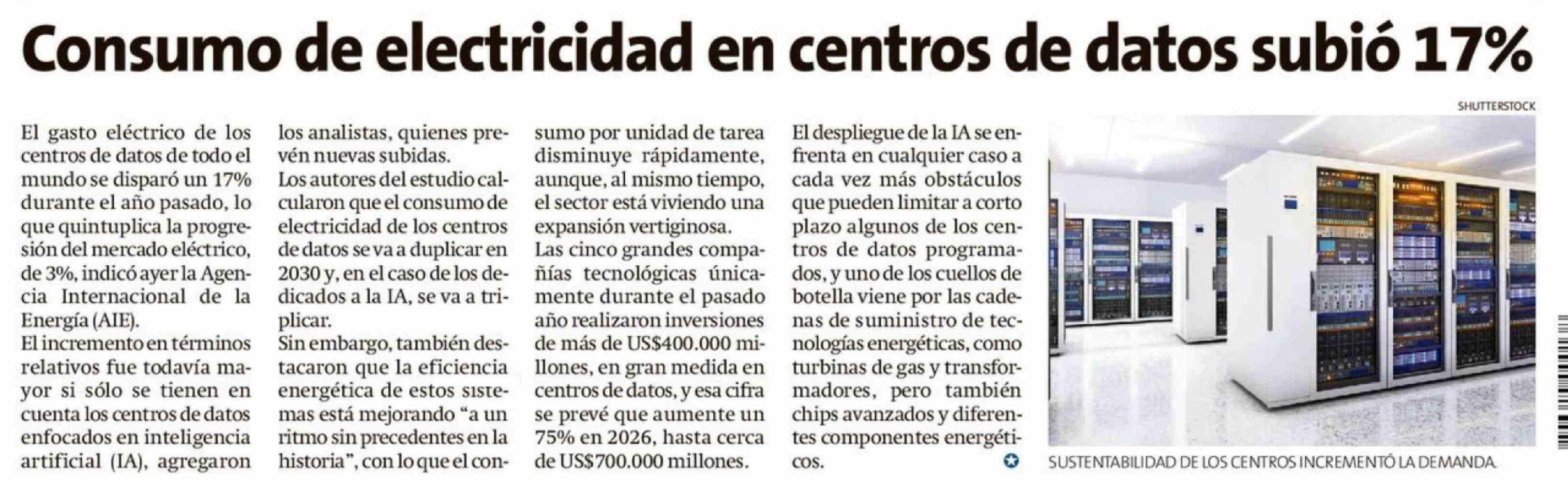 | Título: | Consumo de electricidad en centros de datos subió 17% |