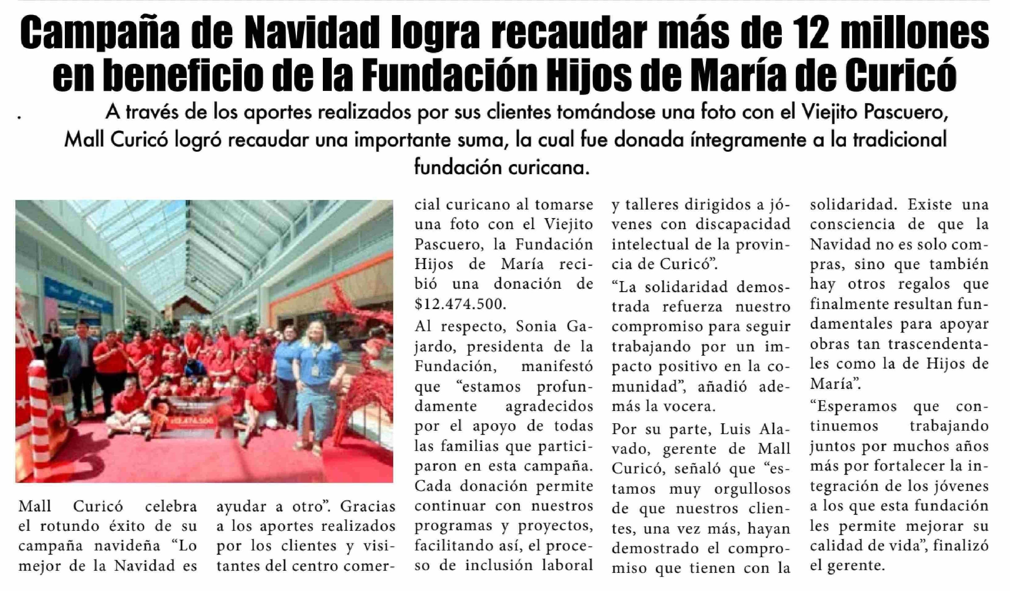 Título: Campaña de Navidad logra recaudar más de 12 millones en beneficio de la Fundación Hijos de María de Curicó