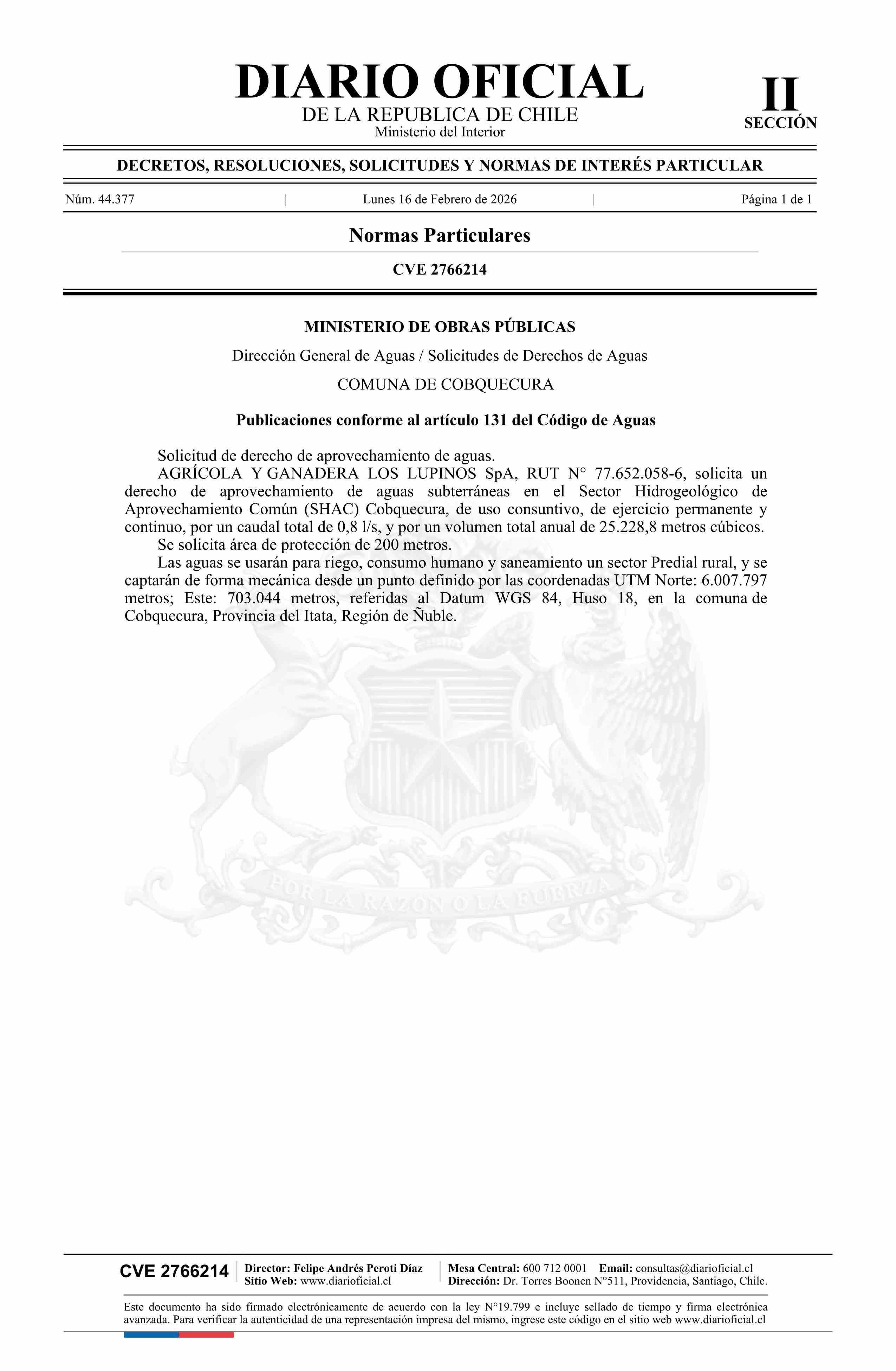 Solicitud Agrícola y Ganadera Los Lupinos SpA 16-02-2026 Diario Oficial Edición Electrónica |
