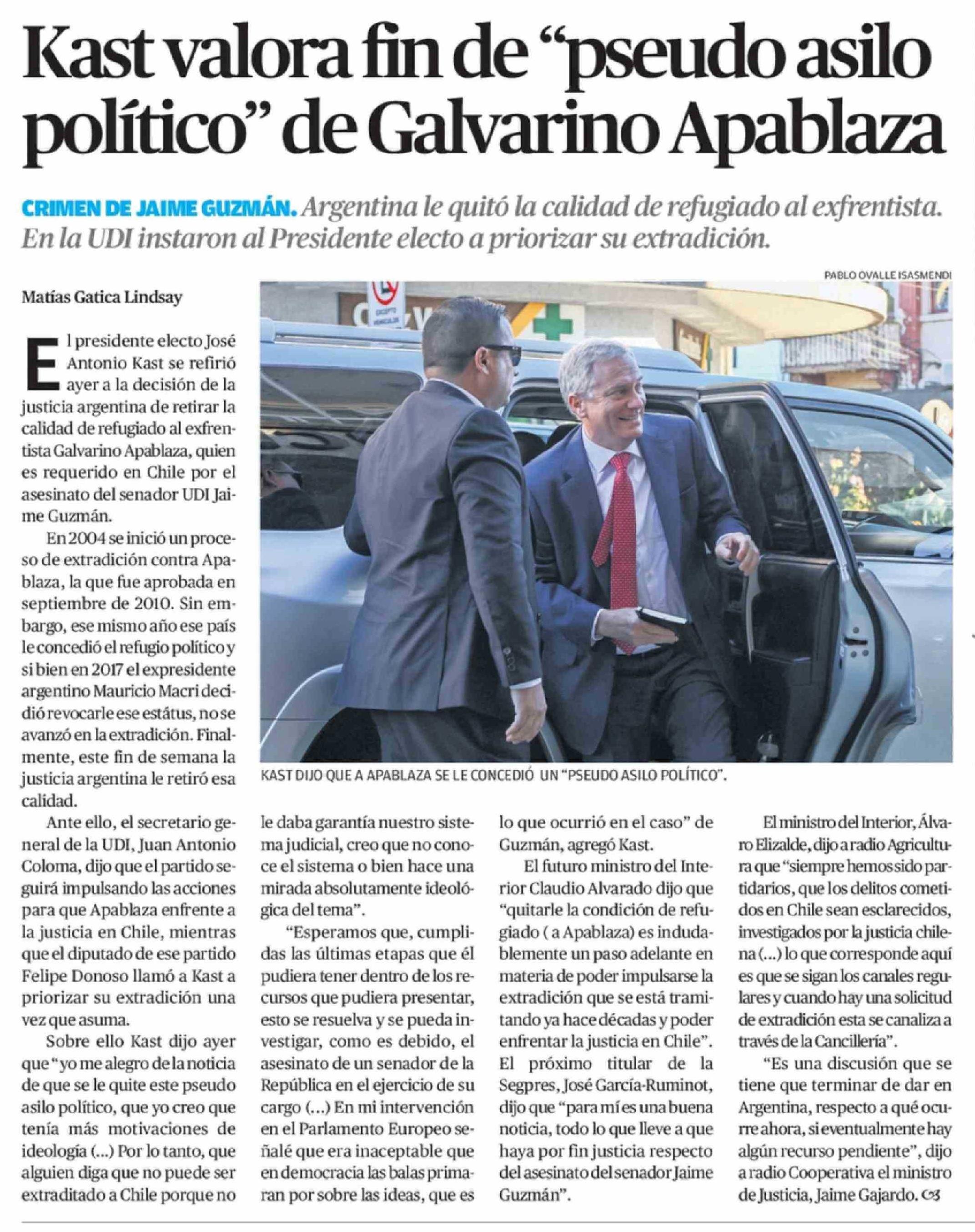 Título: Kast valora fin de "pseudo asilo político" de Galvarino Apablaza