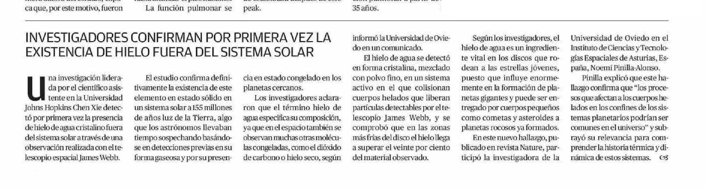 INVESTIGADORES CONFIRMAN POR PRIMERA VEZ LA EXISTENCIA DE HIELO FUERA DEL SISTEMA SOLAR 17-05-2025 El Diario de Atacama |