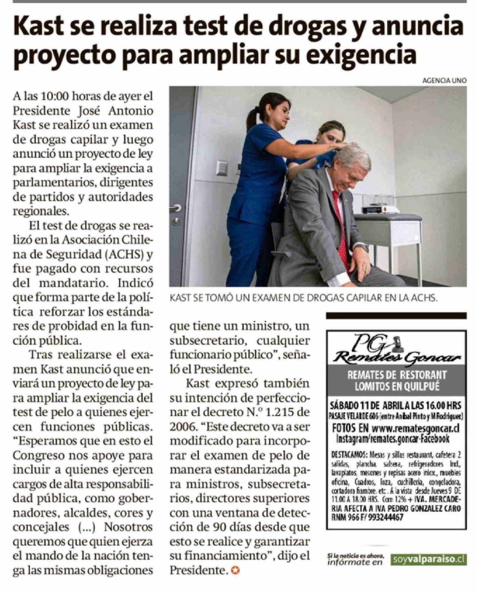 Kast se realiza test de drogas y anuncia proyecto para ampliar su exigencia 09-04-2026 La Estrella de Valparaíso |